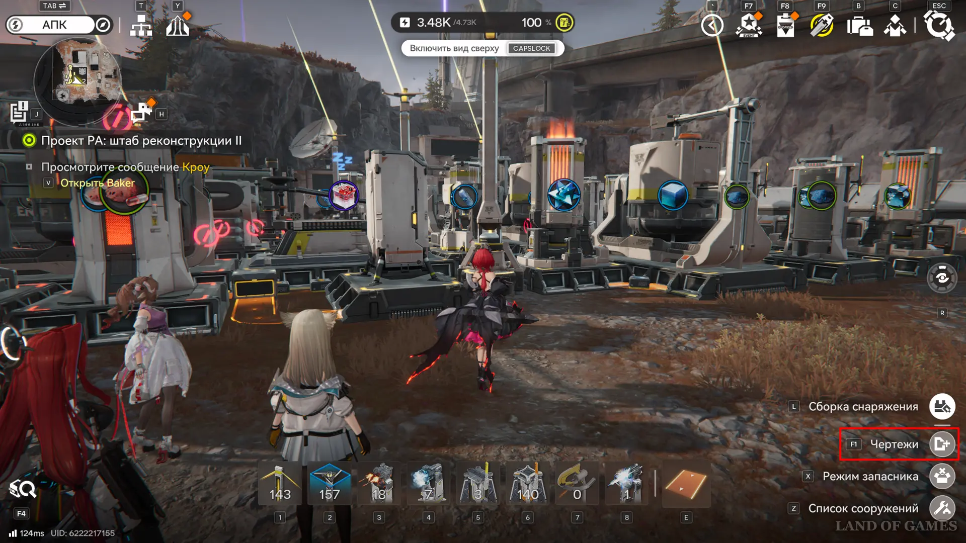 На первых этапах обучения работе в режиме АПК вам представят функцию готовых проектов. Чтобы открыть раздел, встаньте около любой ПБА (главной или аванпоста), а затем кликните по иконке «Чертежи» (на «F1» или через интерфейс в правой части экрана). Здесь вы найдете следующие категории производственных планов (вкладки в верхней части экрана; переключаются на клавиши Q и E):