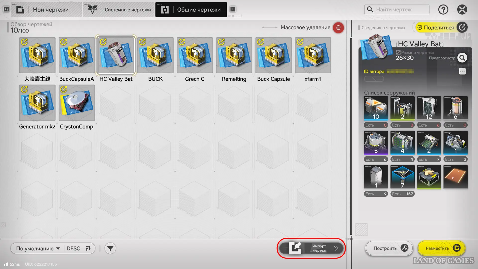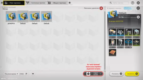 - Общие чертежи — планы построек, сохраненные после импорта кодов других игроков.