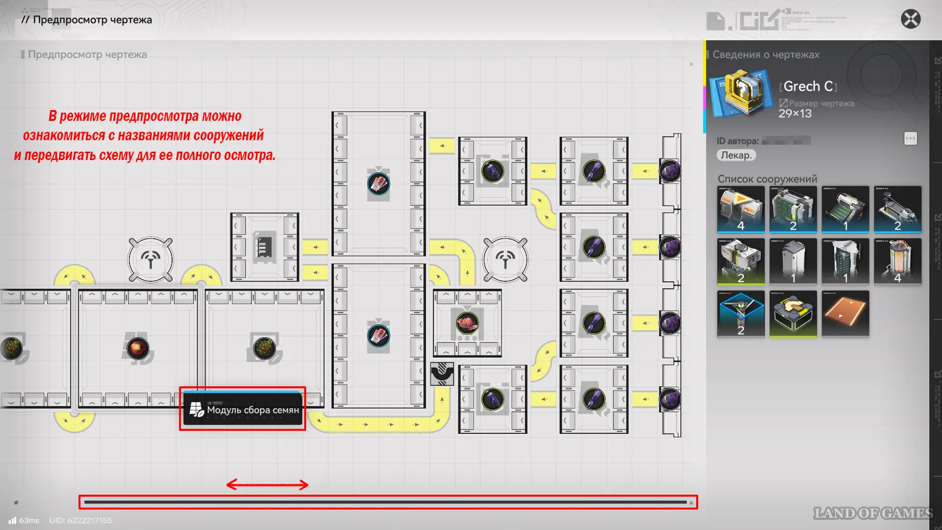 Чтобы детально ознакомиться с планом любой постройки, выберите значок лупы (на панели с названием и комплектующими справа) и перейдите в режим предпросмотра чертежа. Здесь можно проверить масштаб, ознакомиться с названиями сооружений, а также увидеть иконки поступающих и изготавливаемых предметов.