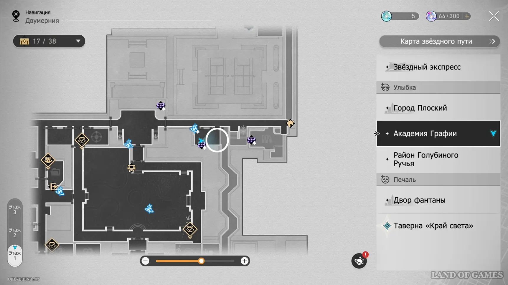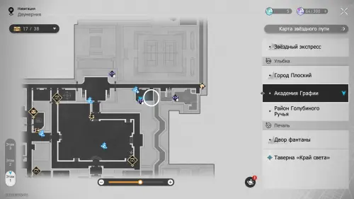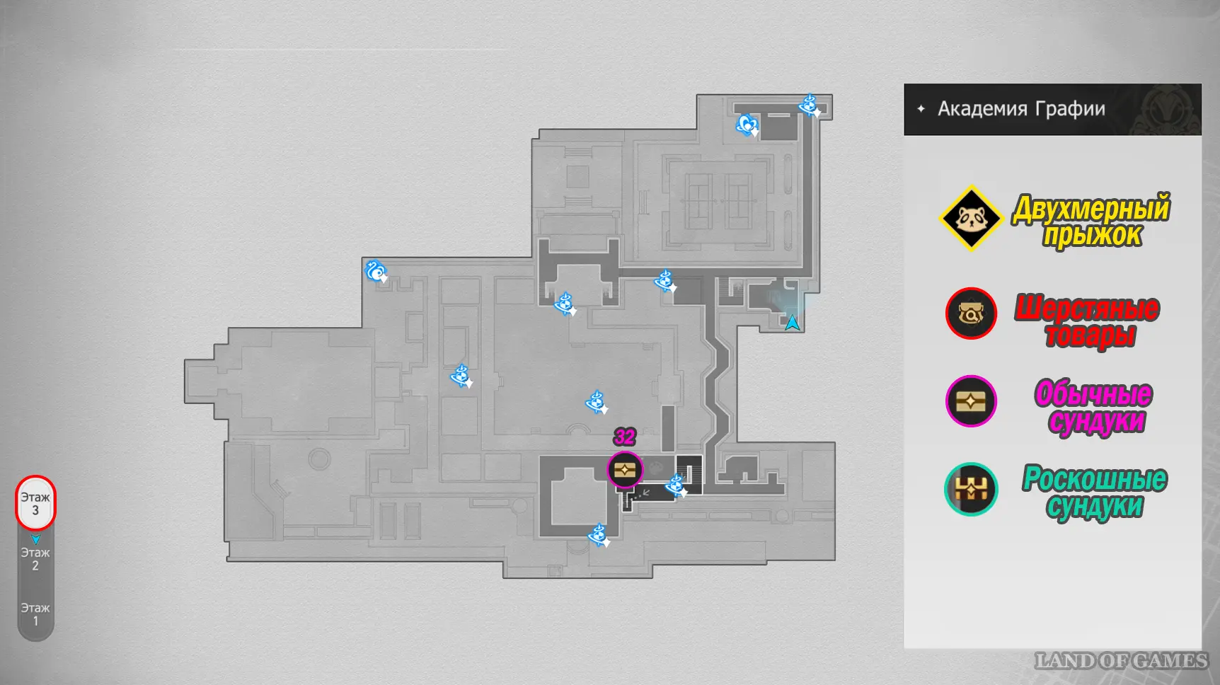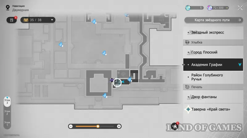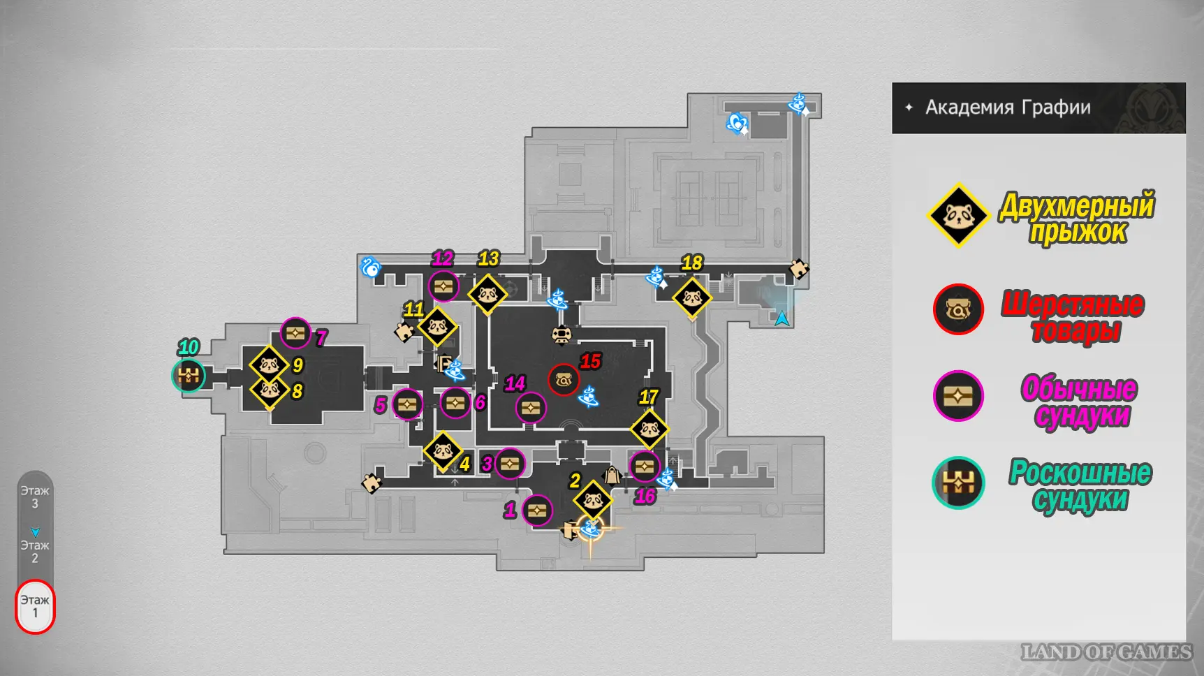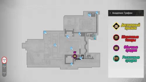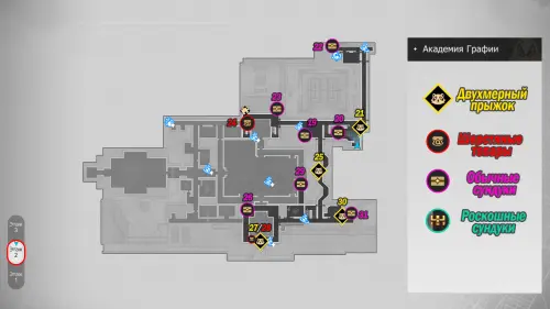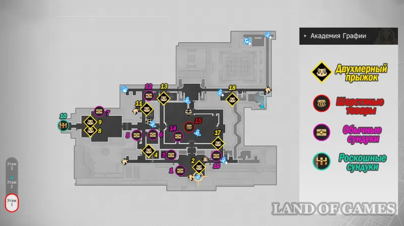 Здание академии состоит из 3-х этажей, в которых можно отыскать 32 точки сбора местных сокровищ (так как в Двухмерных прыжках может быть несколько сундучков, мы обозначим местонахождение входных труб, а уже внутри пункта покажем все трофеи). На картах выше можно будет посмотреть их примерное расположение. Далее мы в деталях расскажем вам, как до них добраться.