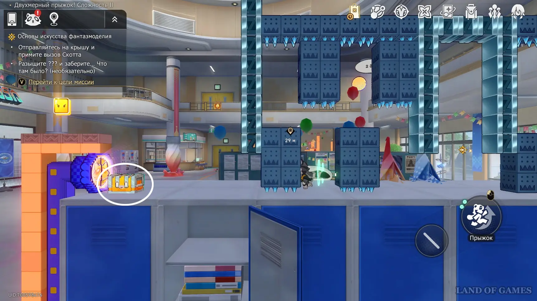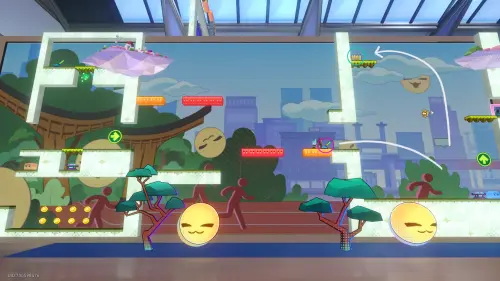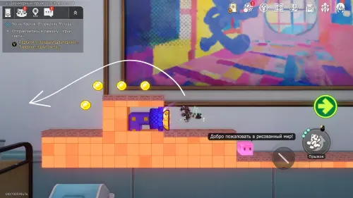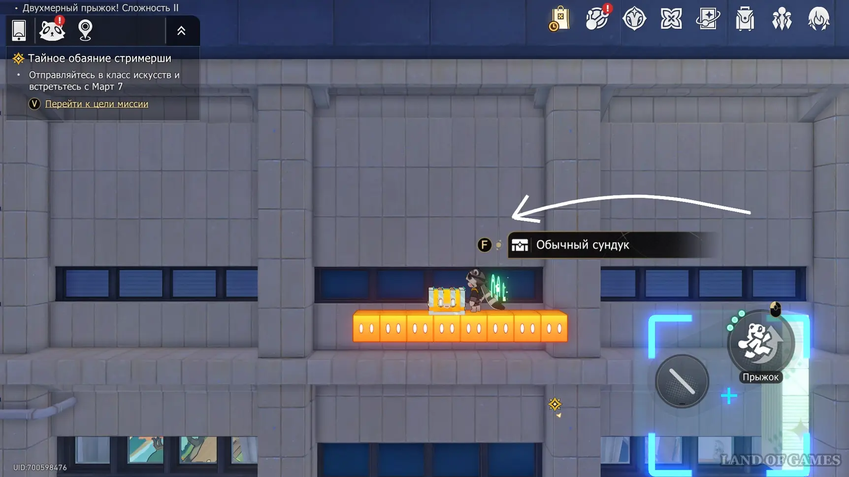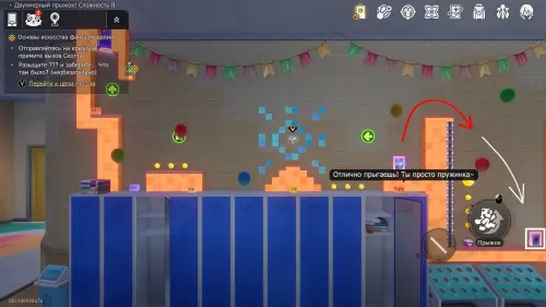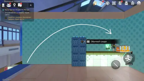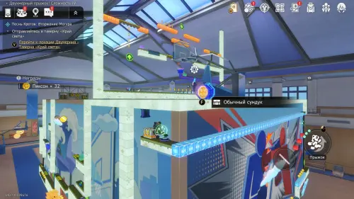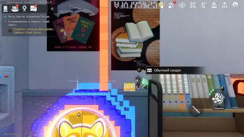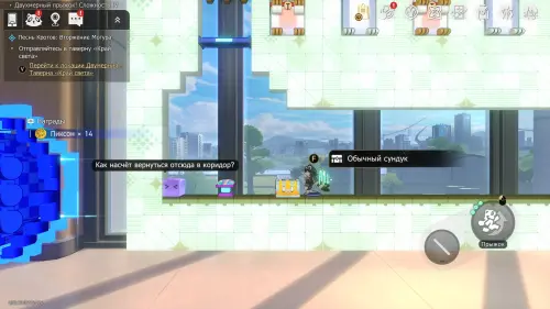 Доберитесь до прохода в класс искусств, перепрыгните его и заверните за угол. Здесь нужно постепенно подняться на верхнюю левую платформу, затем перепрыгнуть обратно — на белый прямоугольный блок над выходом, а уже с него попасть на участок с сундучком.