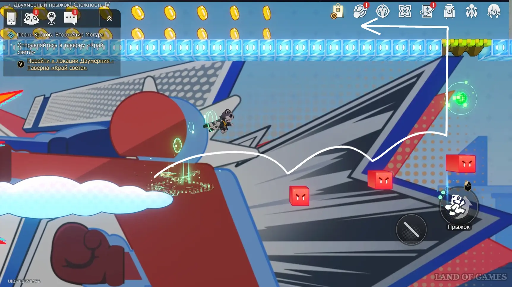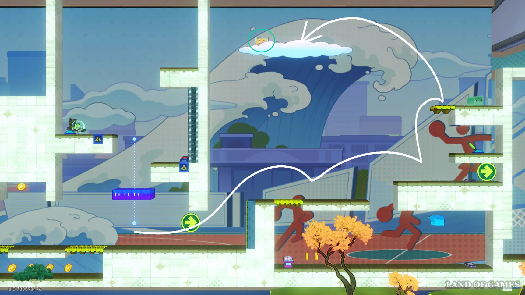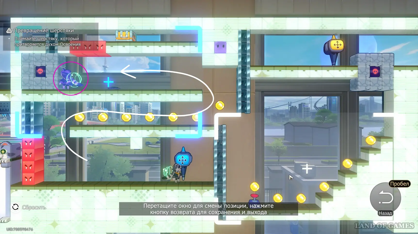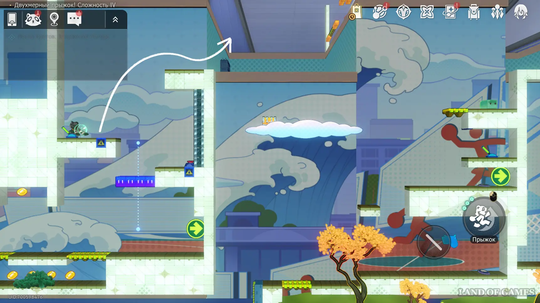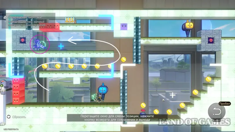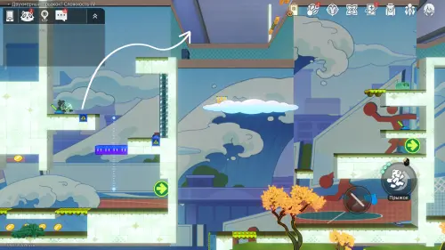 Спуститесь вниз и пересеките стену с ледяной дорожкой, двигаясь вправо. На карте с городским пейзажем поднимитесь наверх и активируйте рычаг, затем бегите вправо к очередному механизму — он откроет путь в область с порталом и батутом. Прыжка с батута должно хватить, чтобы дотянуться до сундука сверху (также используйте аналогичный навык енота).