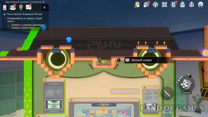 Переместившись на дальнюю карту уровня, поднимаемся вправо (в противоположную от указателей сторону) и прыгаем в портал снизу. В передней части карты пробегаем влево, через коридорчик из движущихся шипованных колонн, и собираем в конце сундучок.