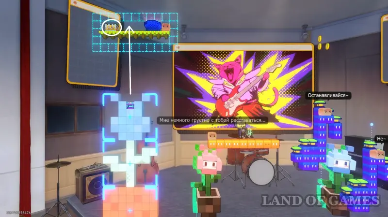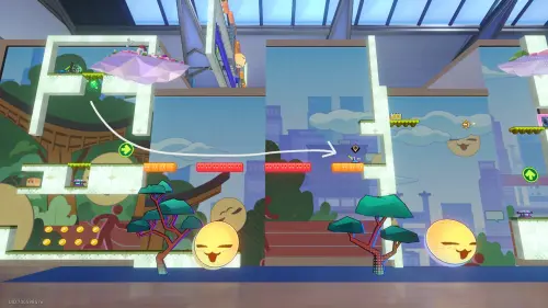 Под выходом из испытания, в левом верхнем углу уровня с нотами, вам нужно будет вновь поменять местами экраны — сделайте из блоков тюльпан и подпрыгните на батуте в центре голубого бутона, тем самым попав к награде.