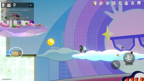 Пересекаем первую площадку и разворачиваем поле вправо, а затем прыгаем вверх над местом поворота (тут будет невидимый участок с лестницей по левой стороне, за которую можно уцепиться и подняться выше). Так получится вернуться назад, попав на площадку перед передвигающимися облаками – используйте их и попадите на противоположный конец, где ждет первый сундучок этого испытания.