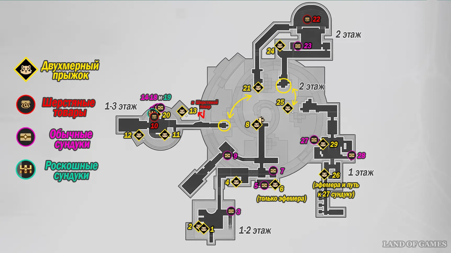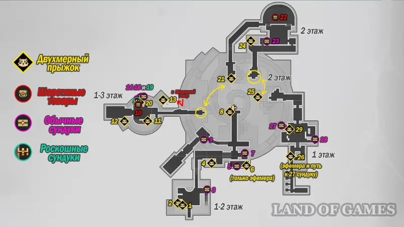 Таверна разделена на три уровня, и на ее территории можно найти более 29 сундуков. При этом часть Двухмерных прыжков содержит сразу несколько наград — мы отметим входные трубы и подробно покажем все доступные трофеи в каждой локации. На карте выше можно будет посмотреть их примерное расположение. Далее мы в деталях расскажем вам, как до них добраться.