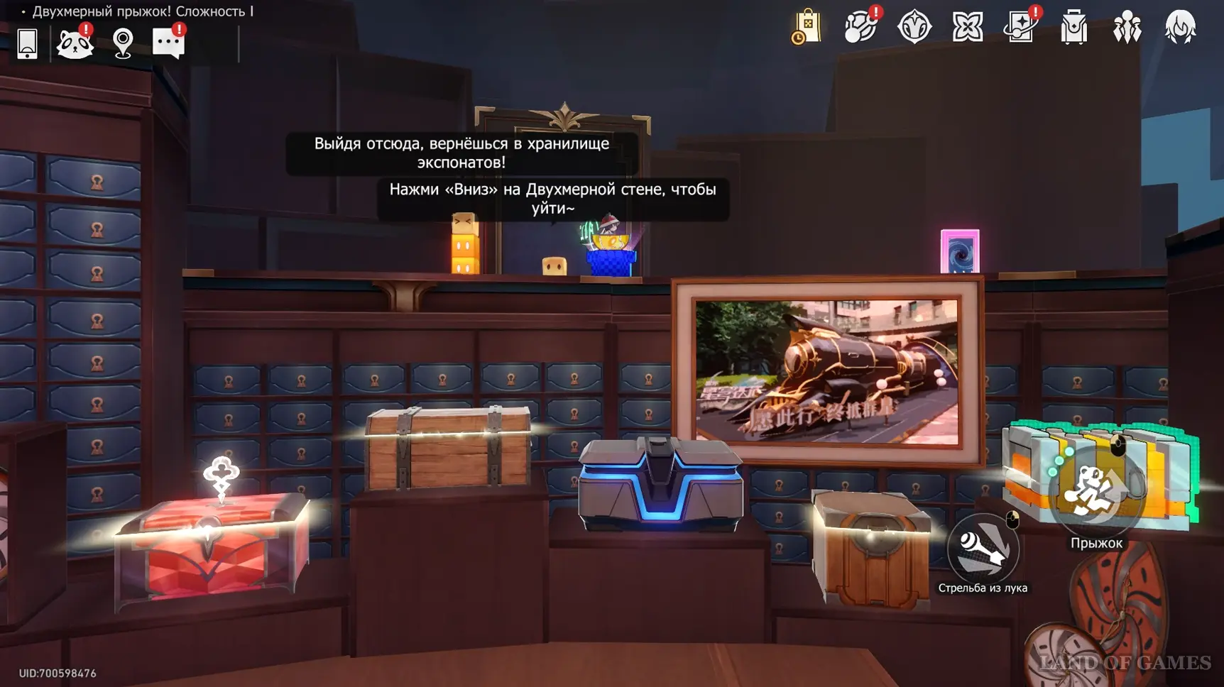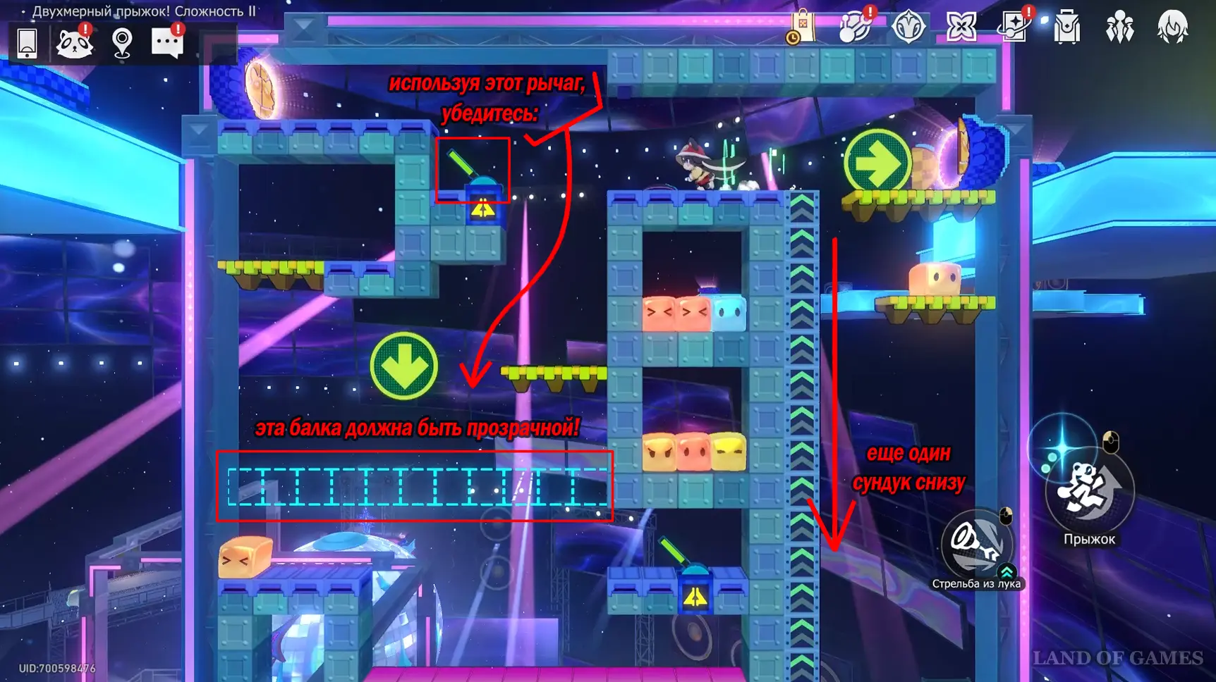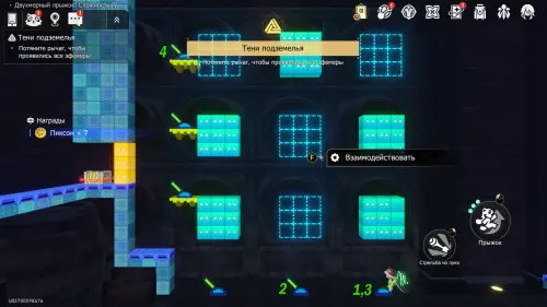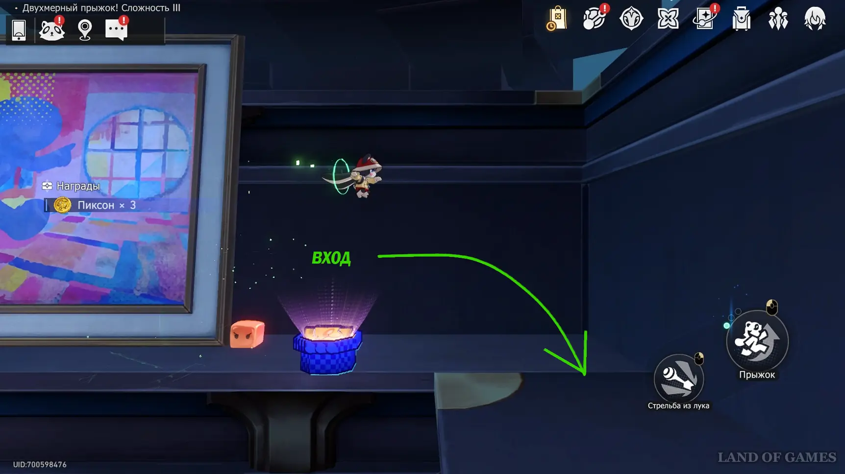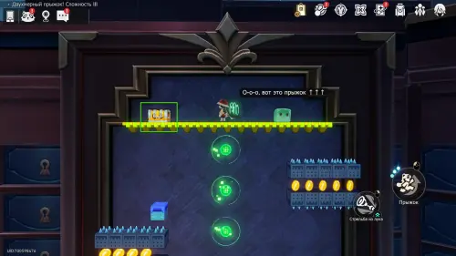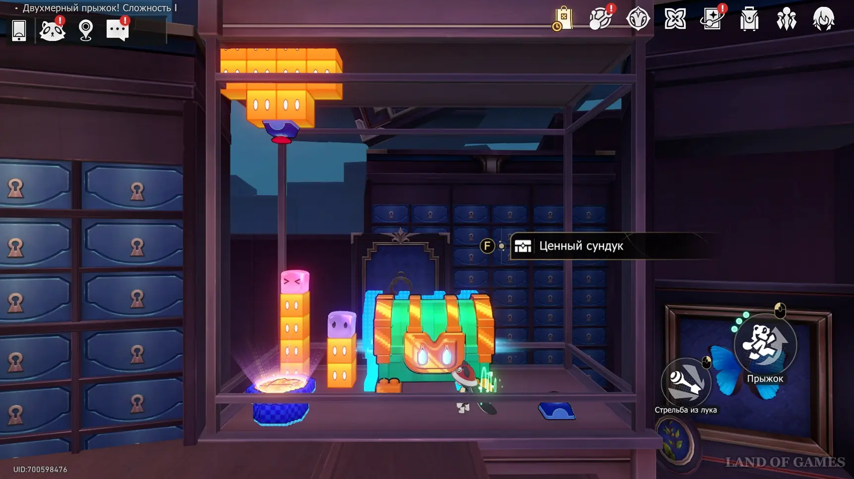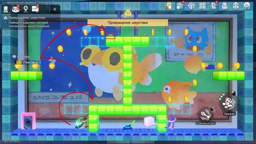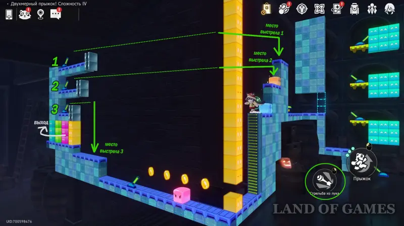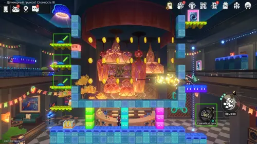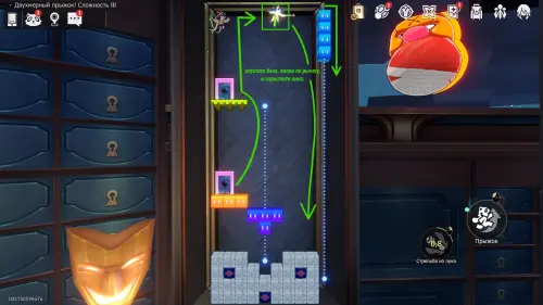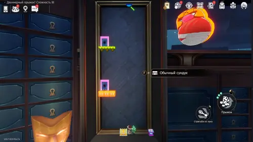 Получив последнюю награду предыдущего пункта и выйдя из испытания, вы переместитесь на второй этаж башни с винтовой лестницей над хранилищем. Зайдите в углубление с картинами на юго-западе и начните новый платформер.