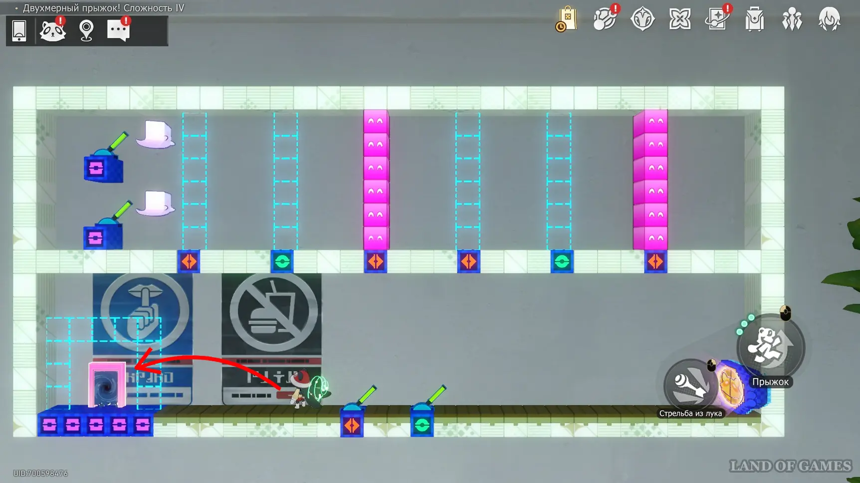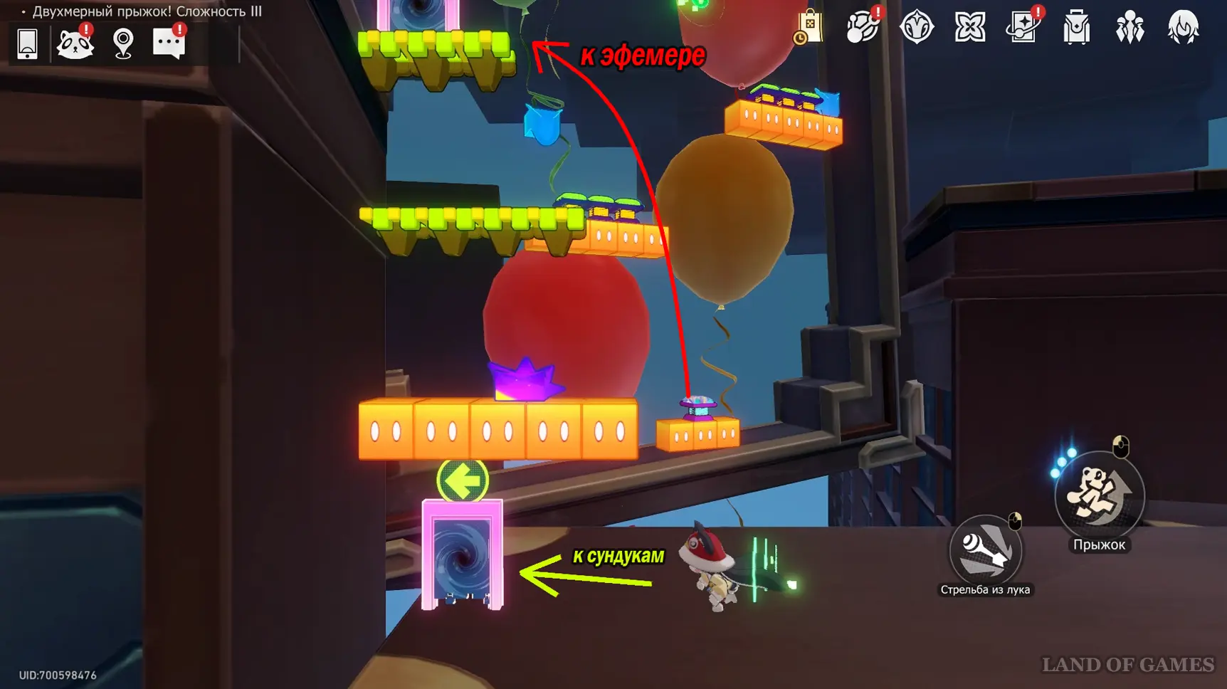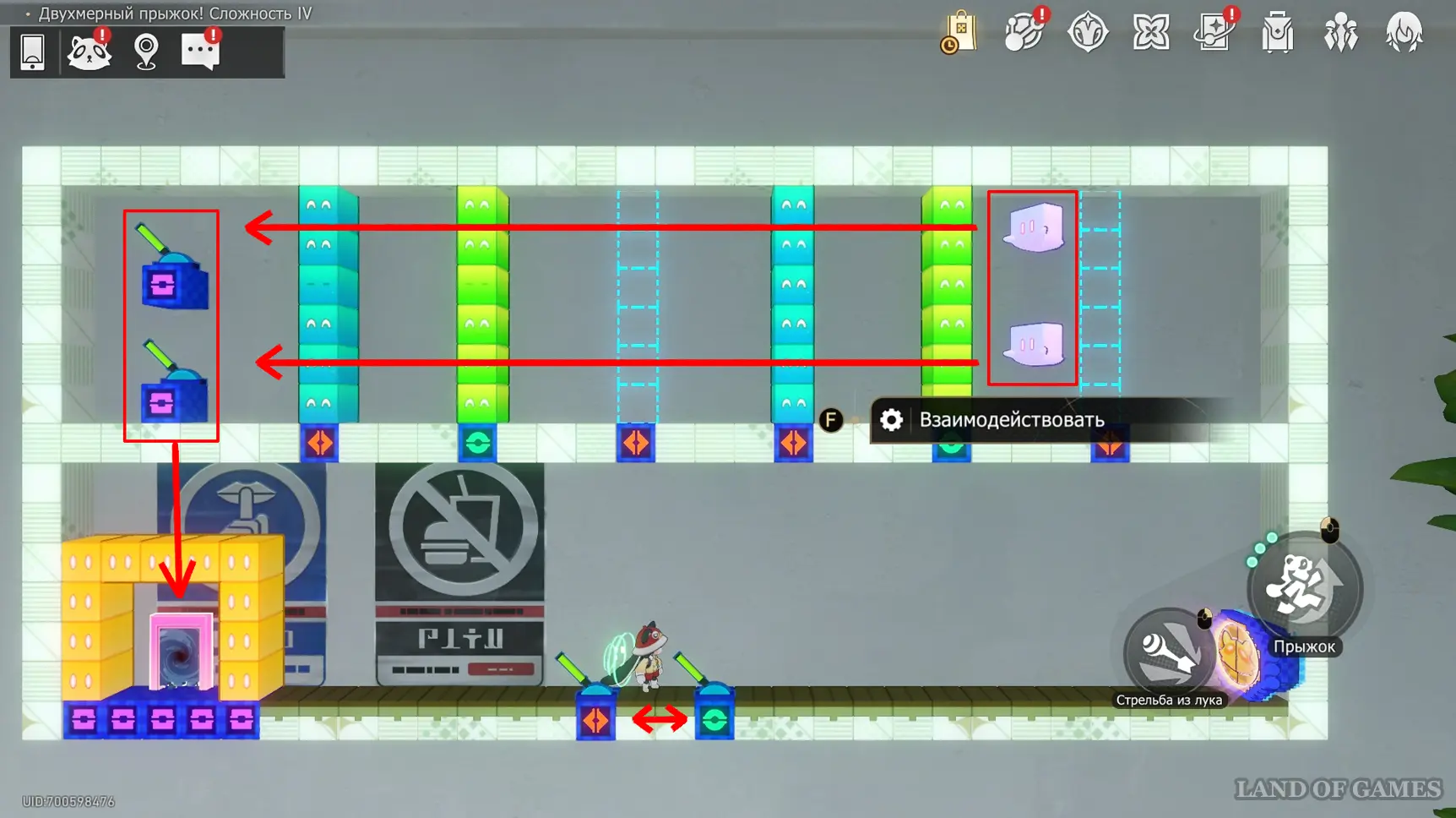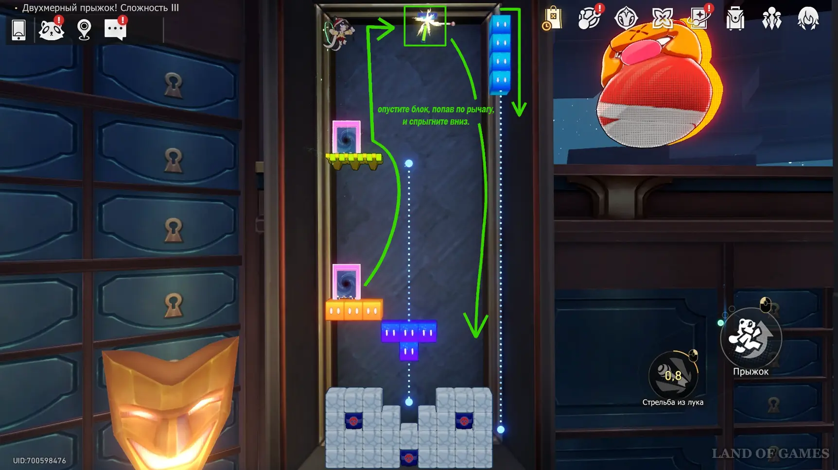 Получив последнюю награду предыдущего пункта и выйдя из испытания, вы переместитесь на второй этаж башни с винтовой лестницей над хранилищем. Зайдите в углубление с картинами на юго-западе и начните новый платформер.