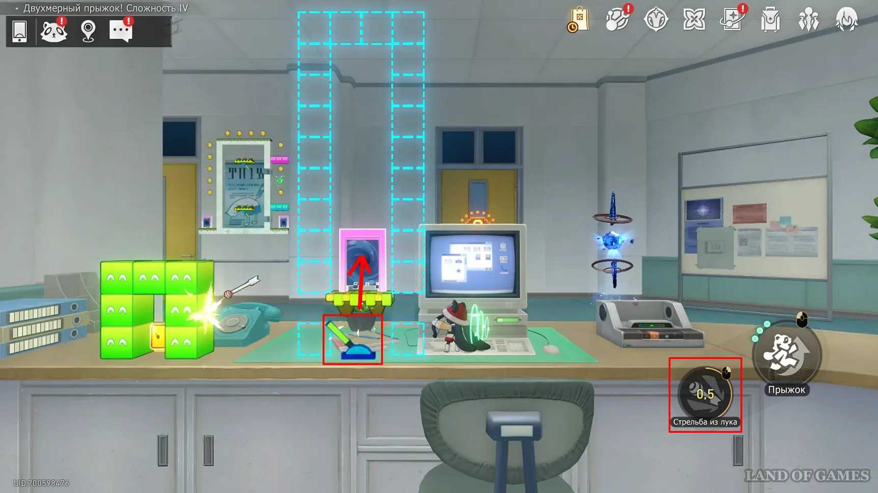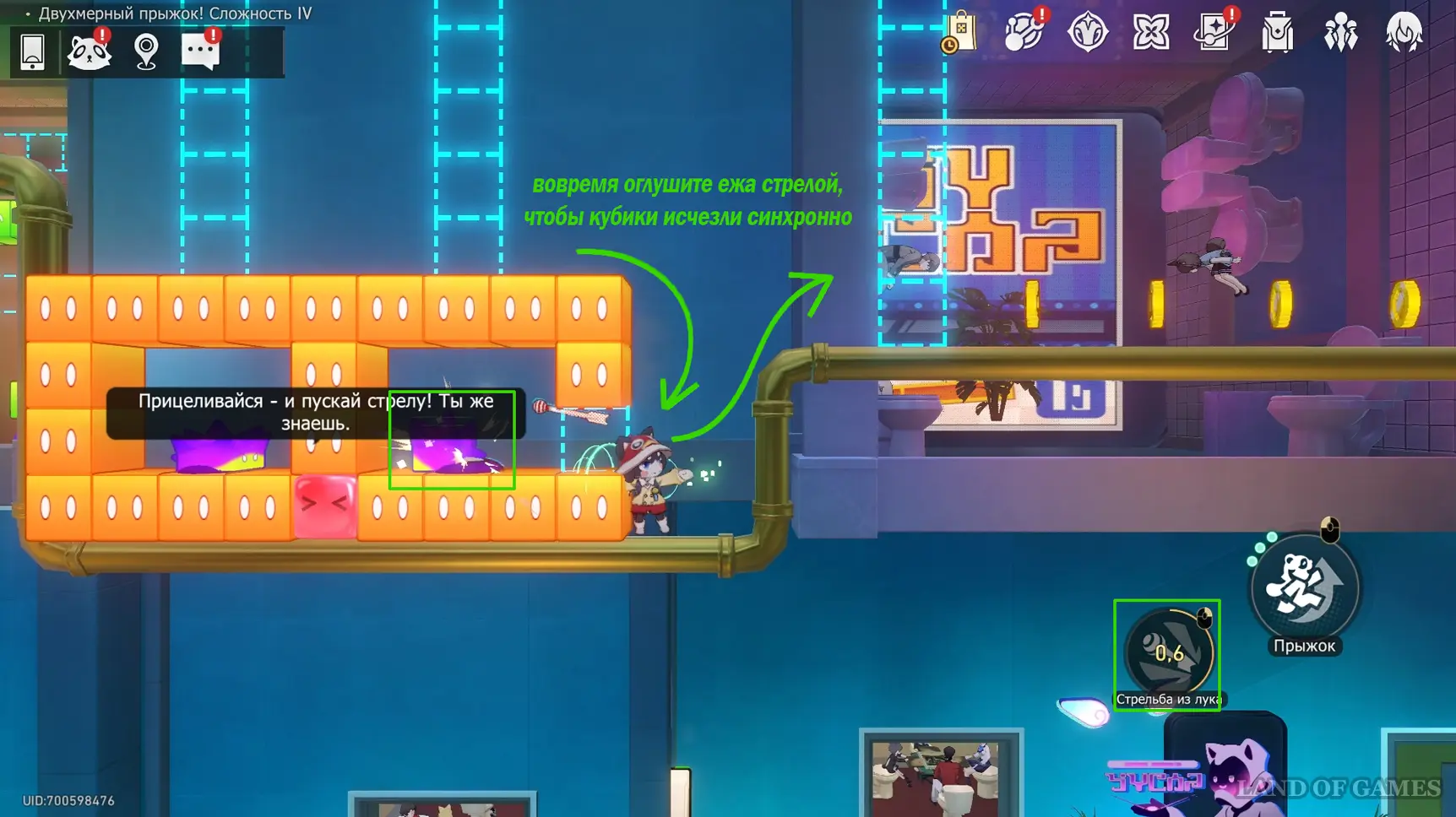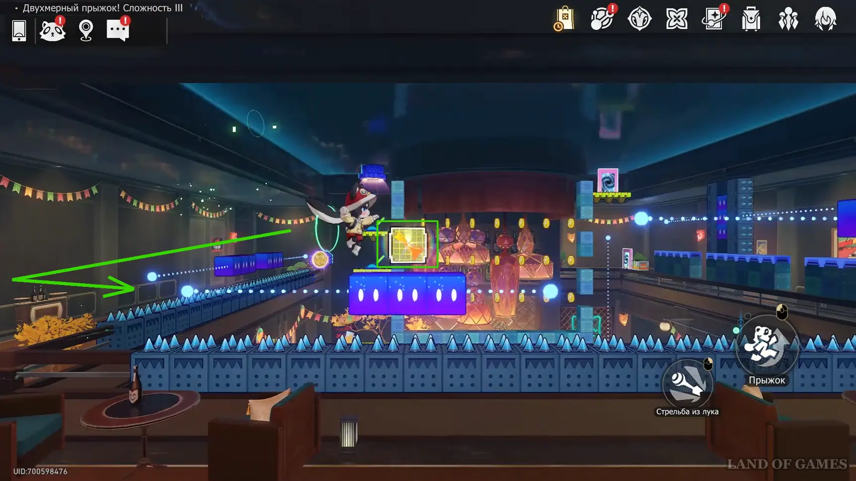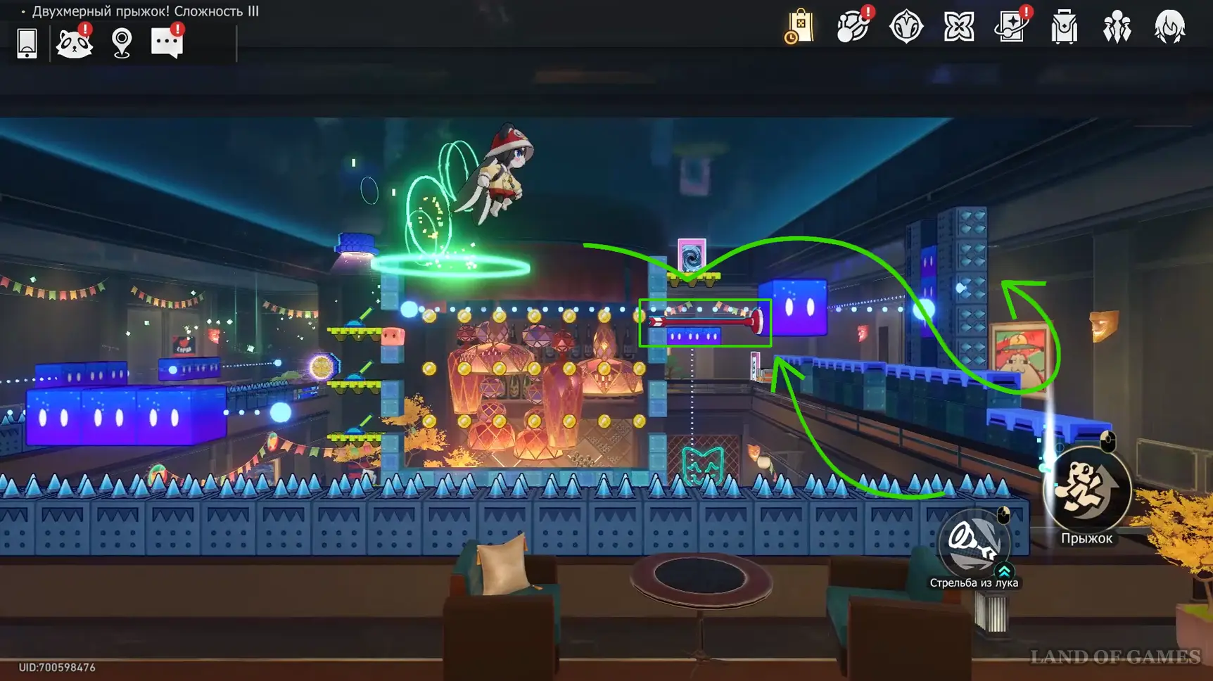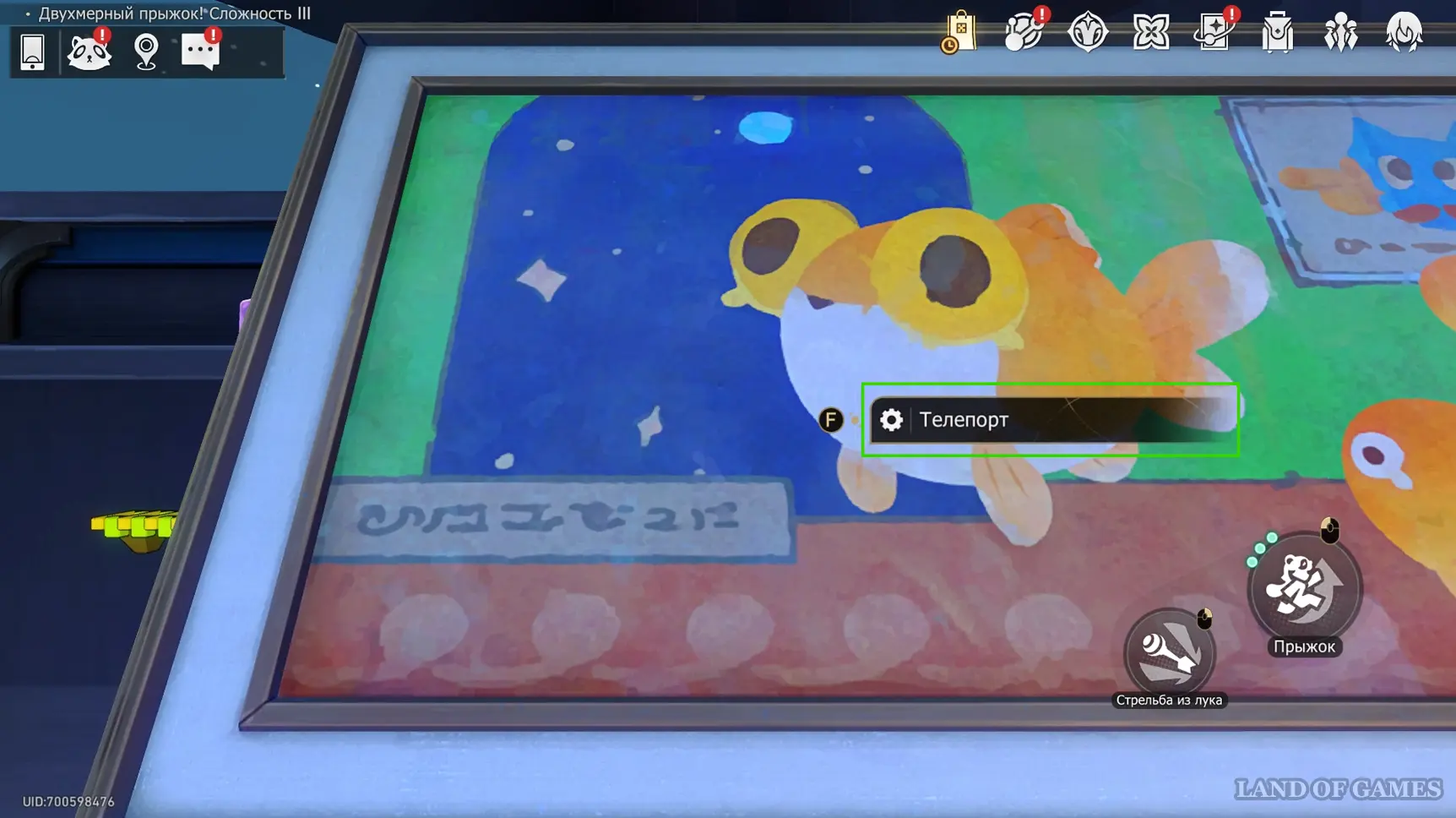 Получив последнюю награду предыдущего пункта и выйдя из испытания, вы переместитесь на второй этаж башни с винтовой лестницей над хранилищем. Зайдите в углубление с картинами на юго-западе и начните новый платформер.