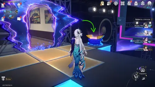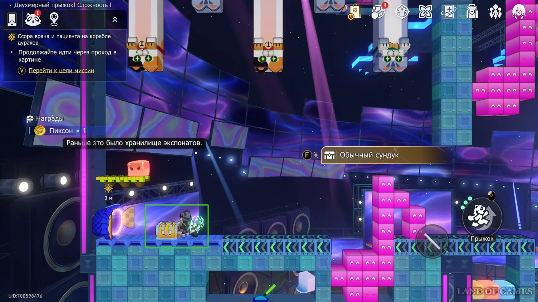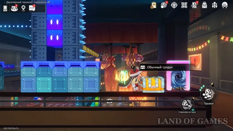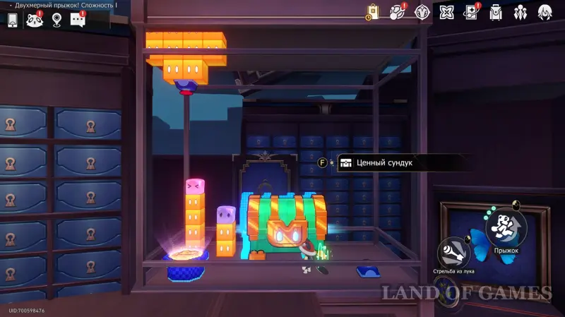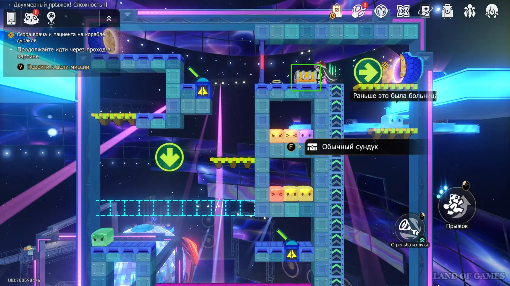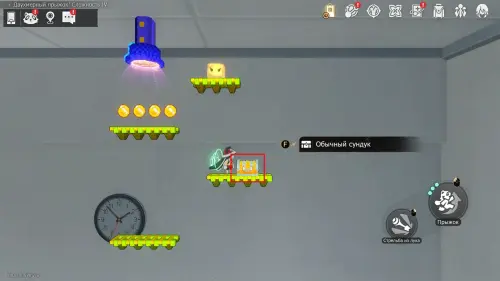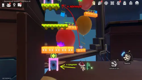 Сундучок в испытании Двухмерного прыжка около Звезды блаженства вы, скорее всего, заберете по ходу сюжетного квеста «Ссора врача и пациента на корабле дураков». Он находится на зеленом уступе в верхнем левом углу относительно выхода.