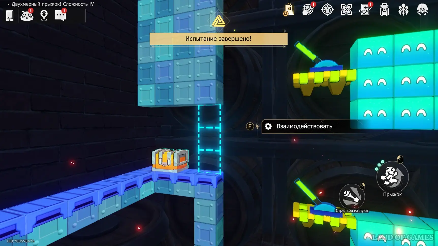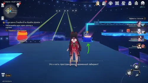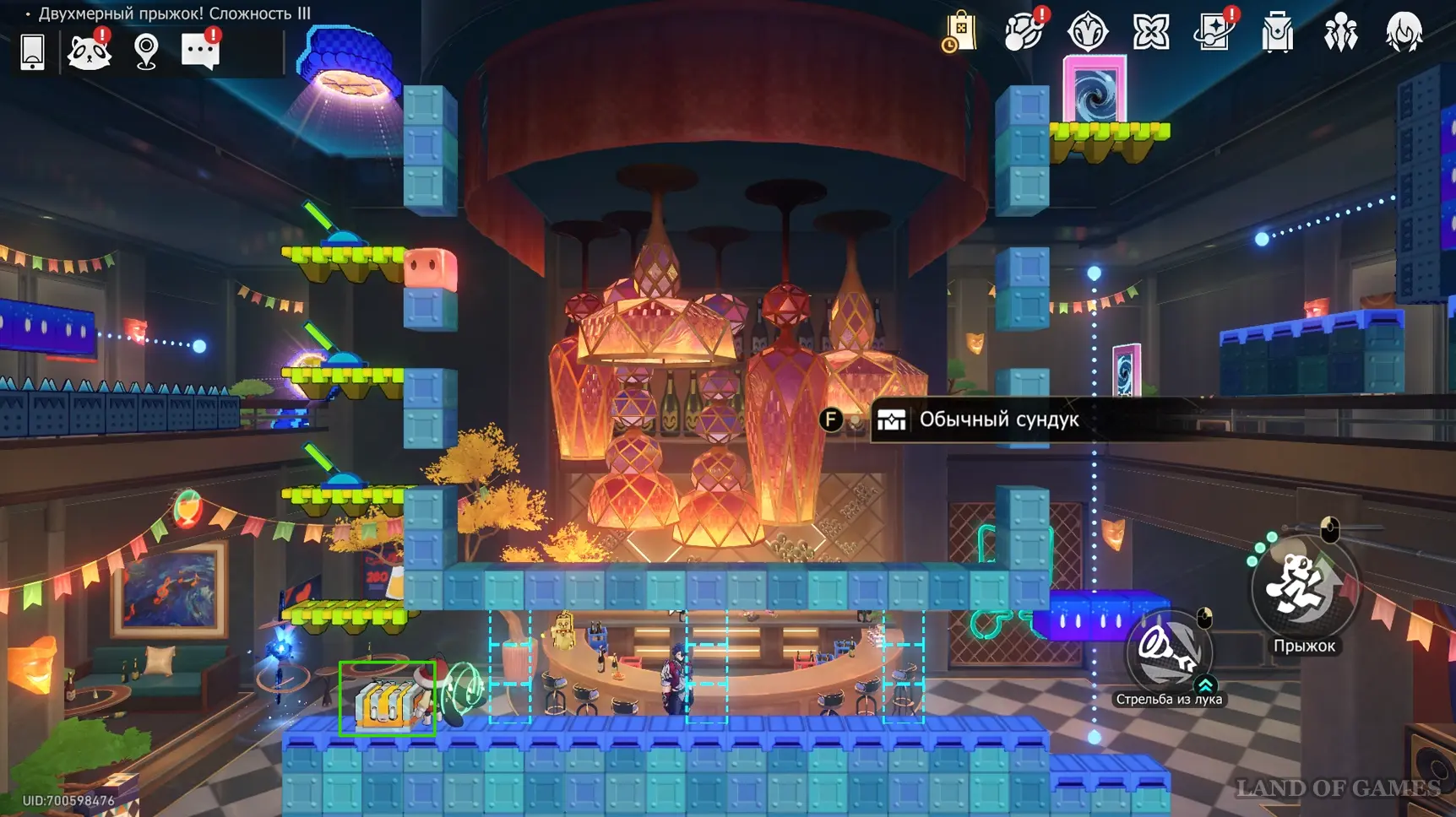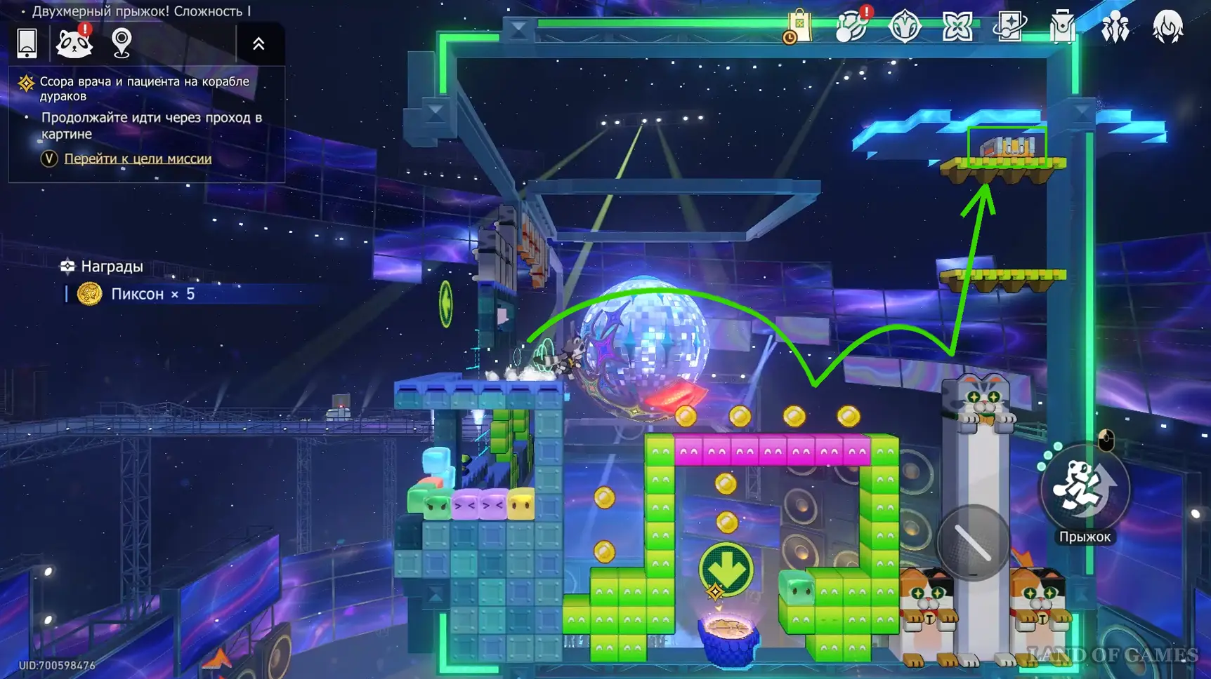 Сундучок в испытании Двухмерного прыжка около Звезды блаженства вы, скорее всего, заберете по ходу сюжетного квеста «Ссора врача и пациента на корабле дураков». Он находится на зеленом уступе в верхнем левом углу относительно выхода.