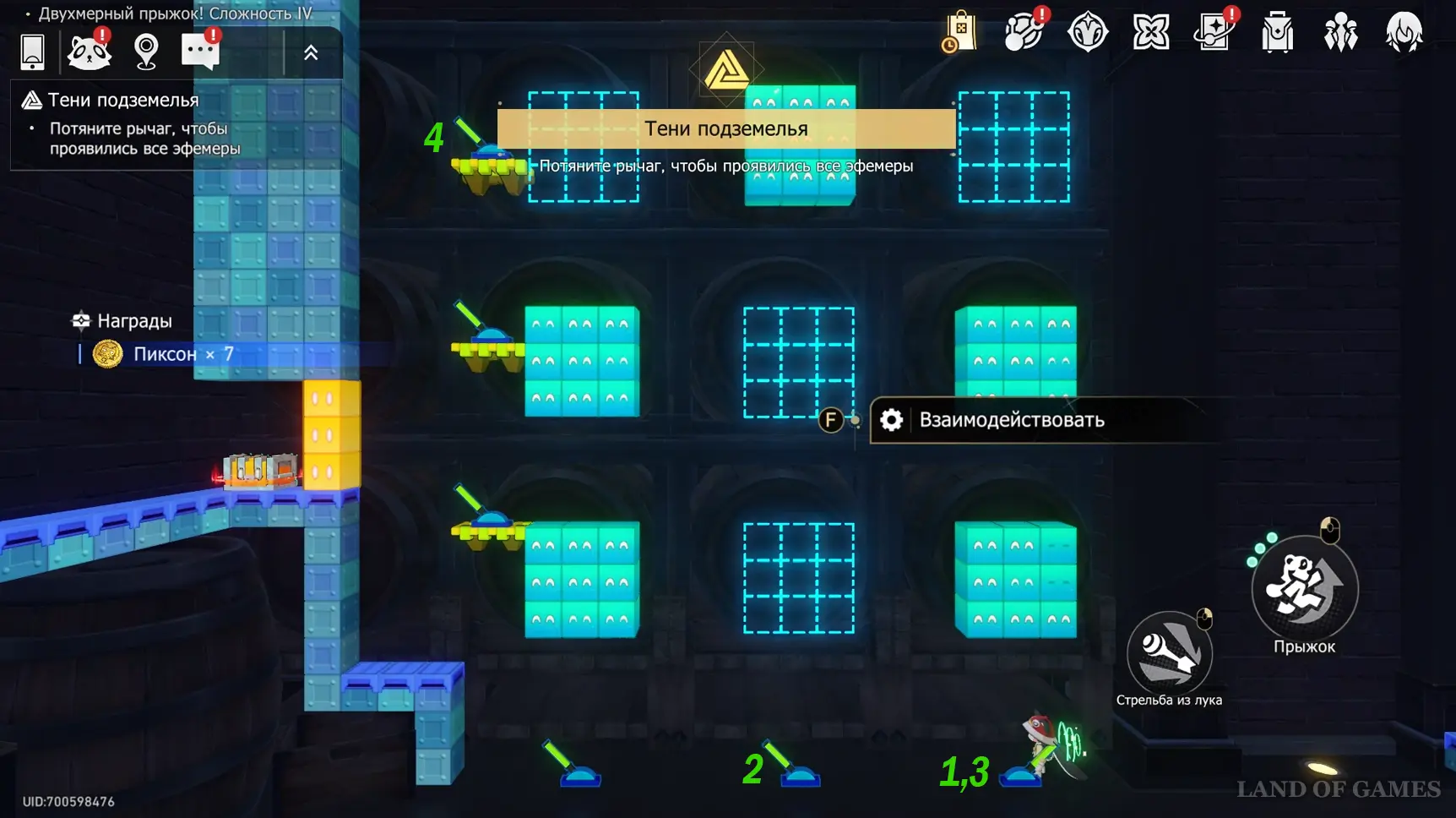 На этапе с голубыми кубами и рычагами нужно сделать все блоки видимыми, а после забрать разблокированный сундучок. Вариантов решения может быть много, но у нас сработал такой: