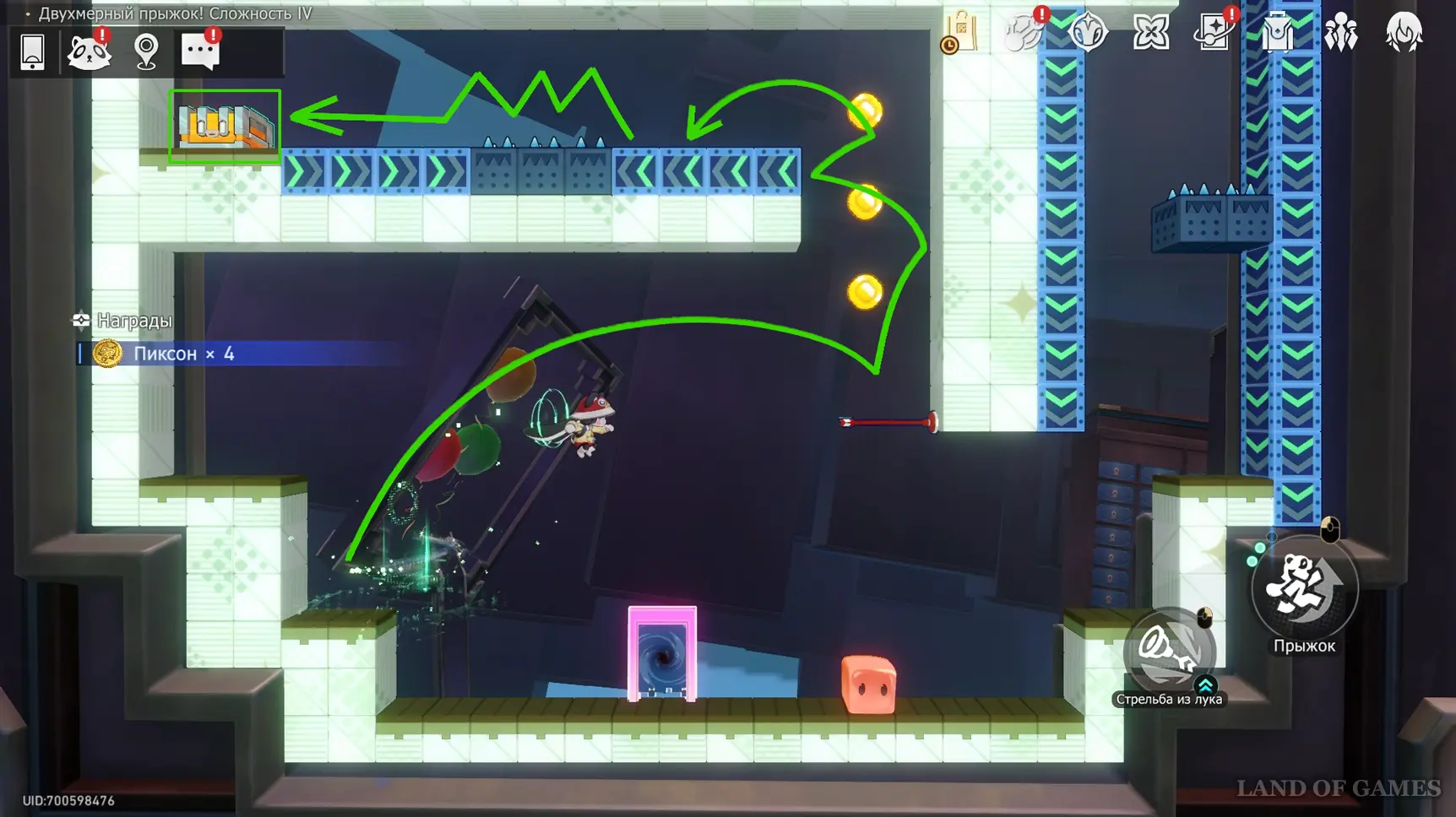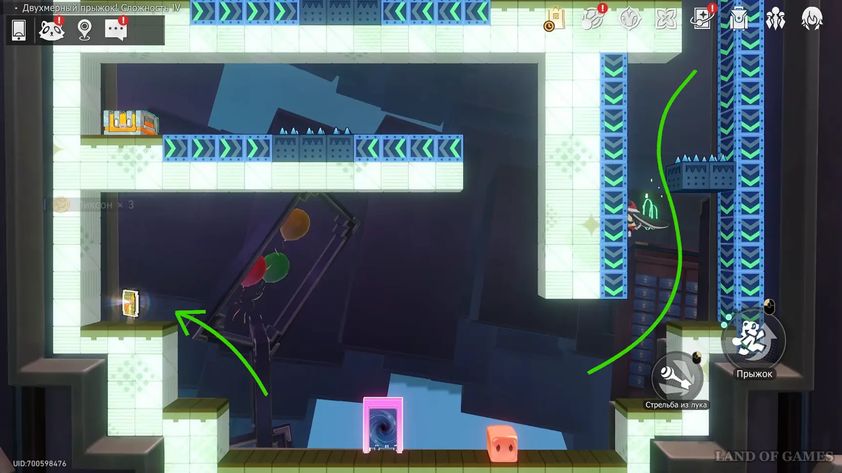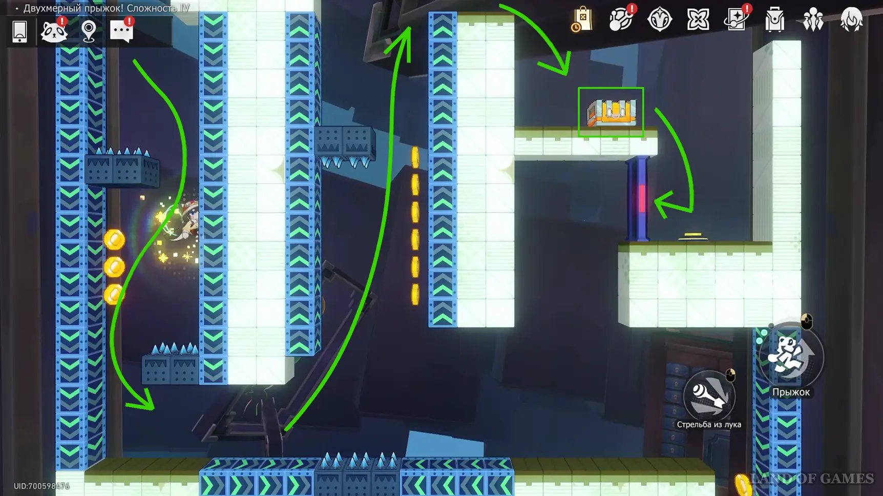 Слева в нижней части карты забираем стрелы-вантузы и используем их, чтобы подняться к сундуку сверху. А чтобы преодолеть шипы в узком коридоре перед наградой, несколько раз очень быстро нажмите прыжок.