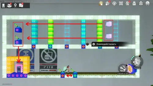 Появившись на уровне, сразу же бегите направо, запрыгните на платформу и дождитесь появления надписи «Телепорт» – нажмите на нее для раскрытия карты. Затем дождитесь возникновения своего двойника и запрыгните на самую верхнюю площадку. Когда он нажмет на кнопку и дверь откроется, коснитесь своего дублера для получения шерстяных товаров.