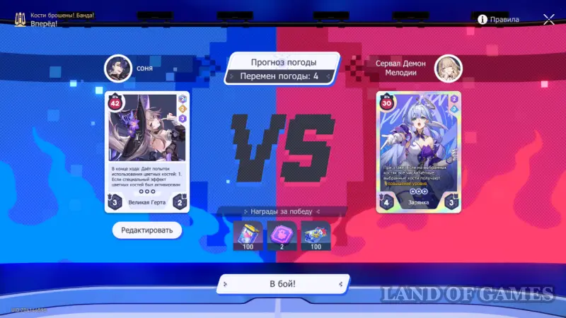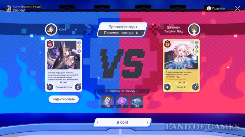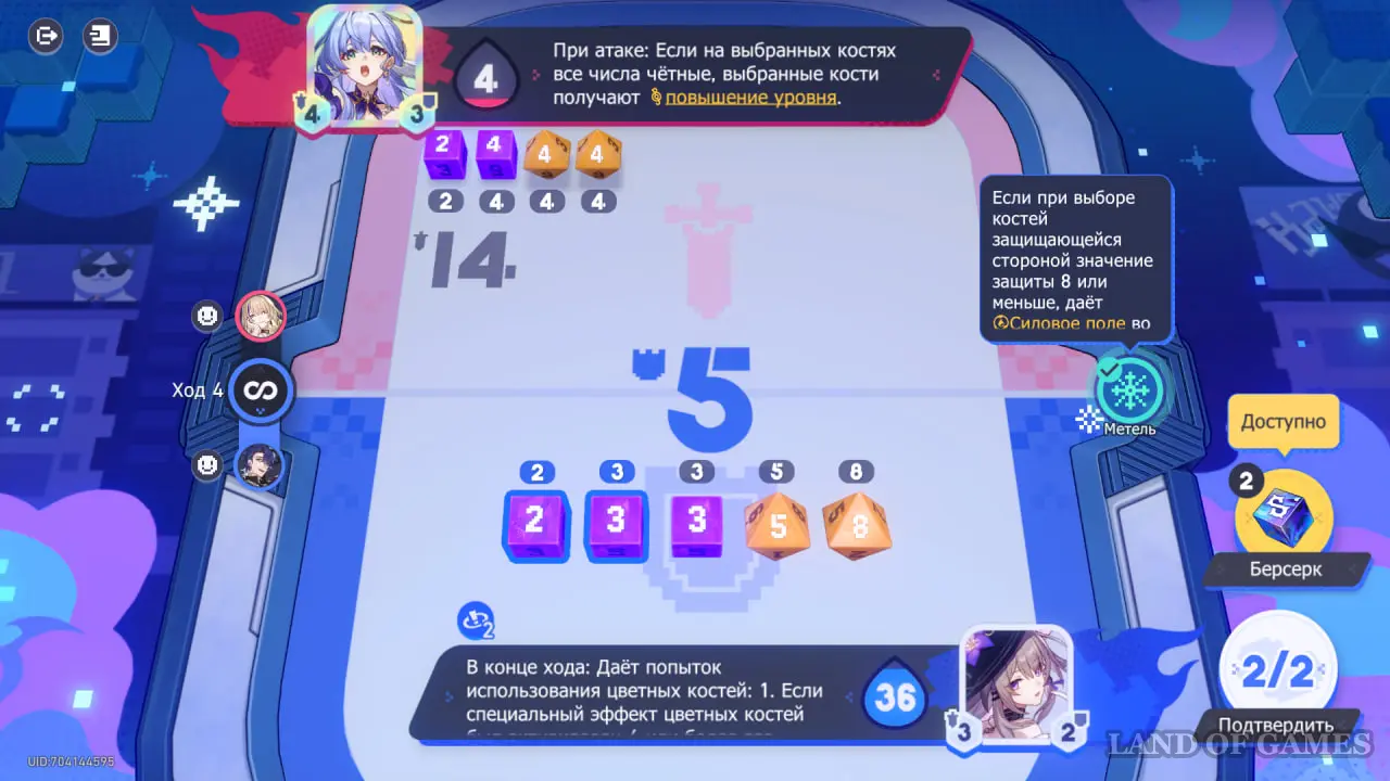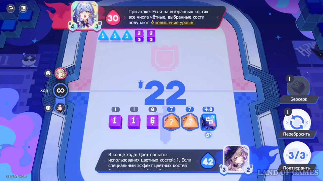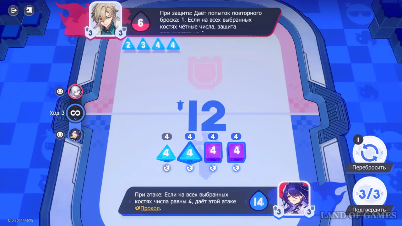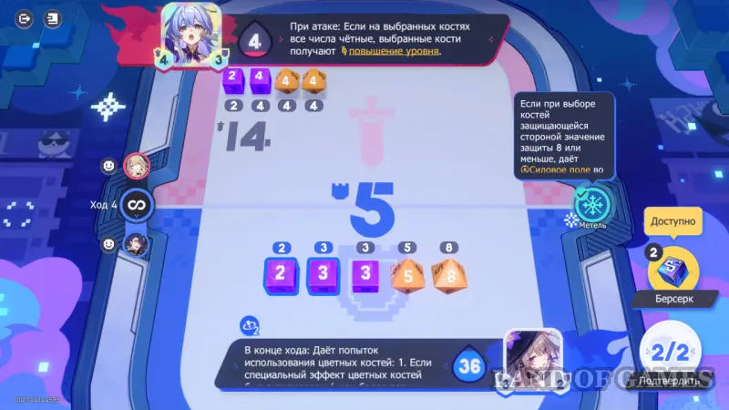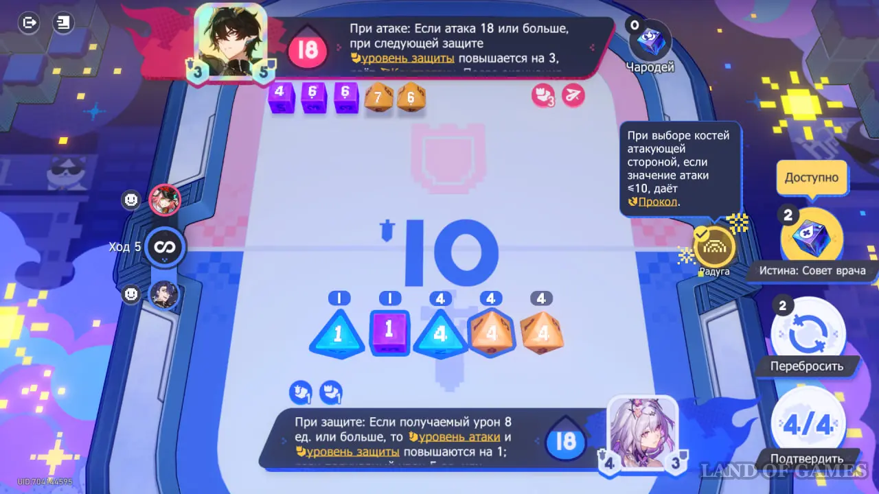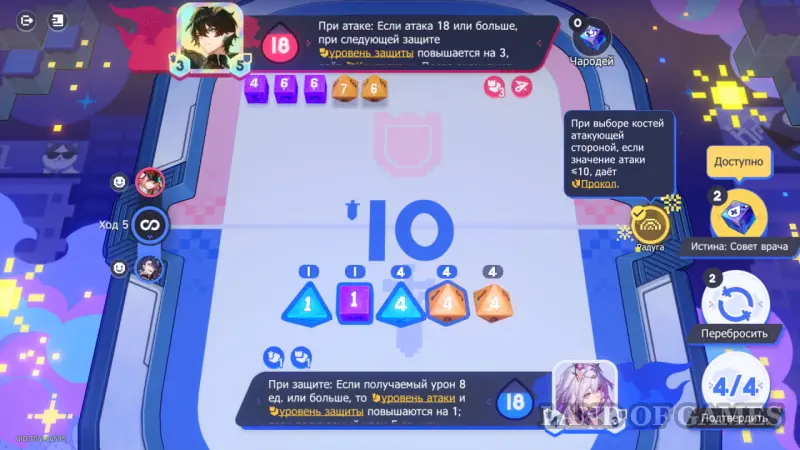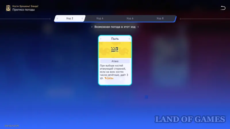 Обратите внимание на эффекты погоды: во время 2 хода можно получить повышение атаки, если выбрать разные числа на костях. На 4 ходу во время атаки, наоборот, стоит выбрать одинаковые числа, чтобы в будущем повысить свой уровень защиты.