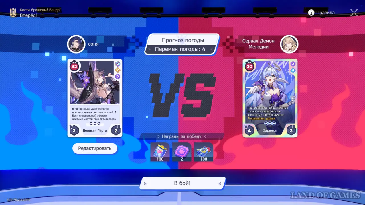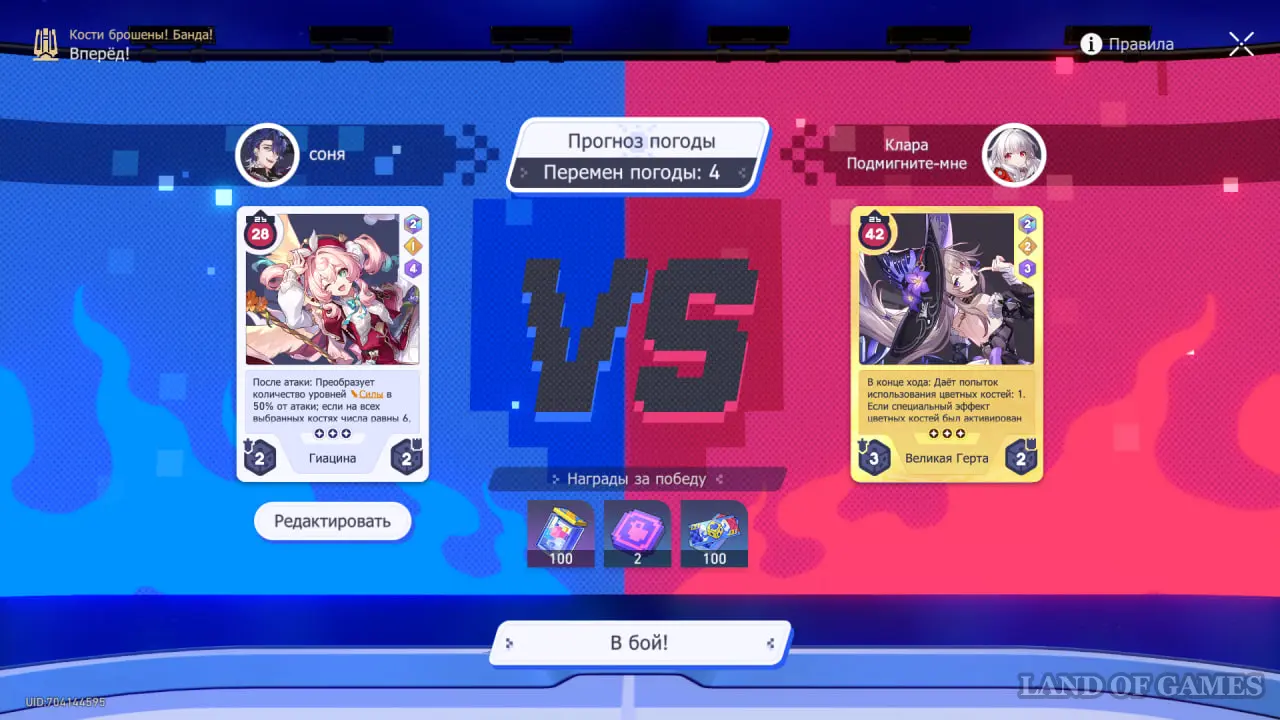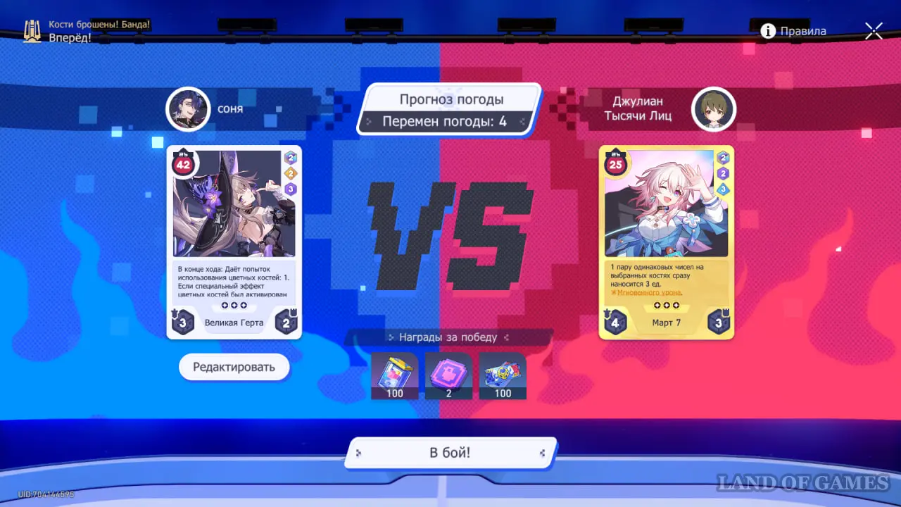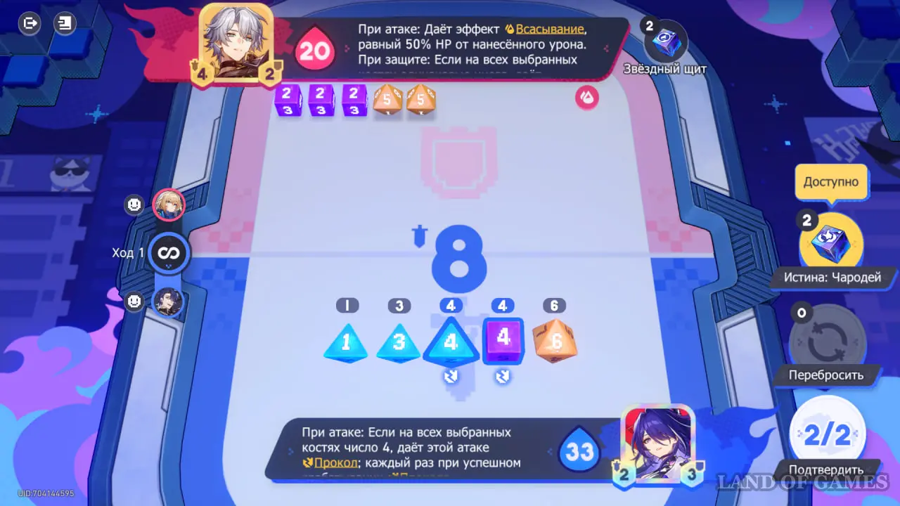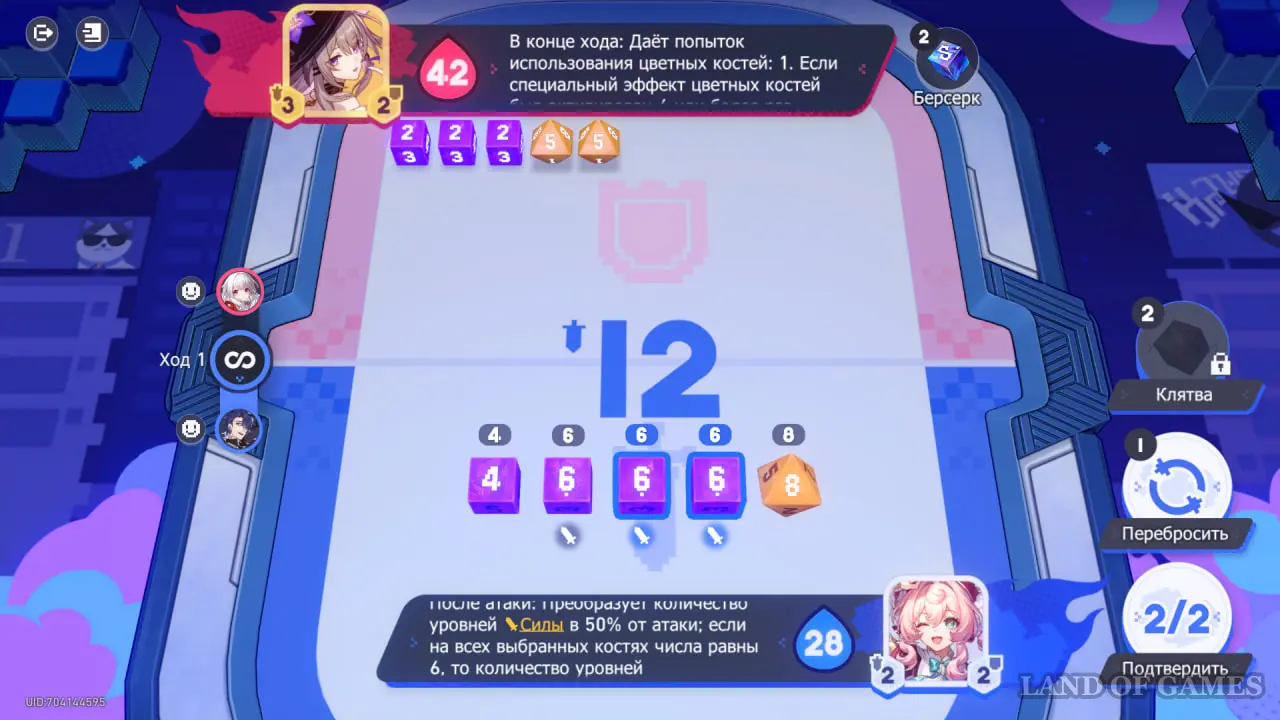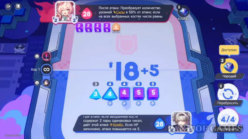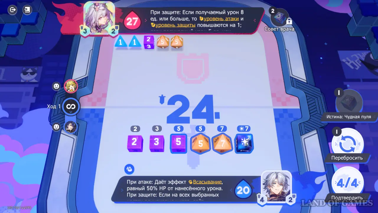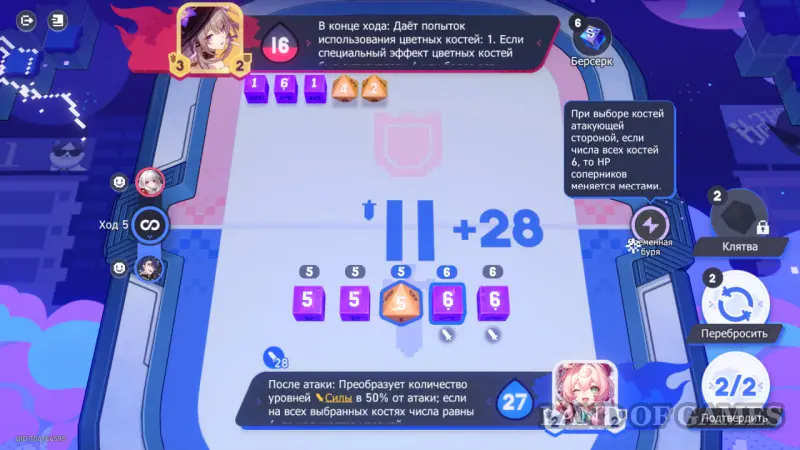 Обратите внимание на эффект погоды на 4 ходу — если вы выберете все кости со значениями 6, ваши ХП и ХП противника поменяются местами. Если ваше здоровье выше, чем у карты противника, стоит выбрать другие значения костей.
