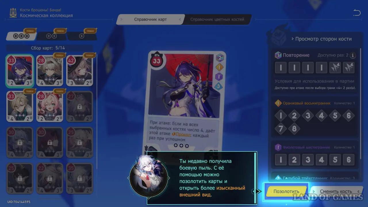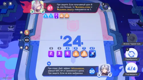 Кроме того, у каждой карты есть особые умения, помогающие в бою. Например, у выбранной для обучения карты Ахерон есть возможность игнорировать защиту противника, если вы выбрали все кости со значениями 4.