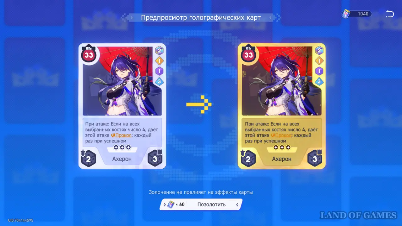 С помощью Боевой пыли, полученной в сражениях, вы можете позолотить любую свою карту. Сделать это можно 2 раза с каждой картой. На силу в сражении это не влияет и дает только косметический эффект.