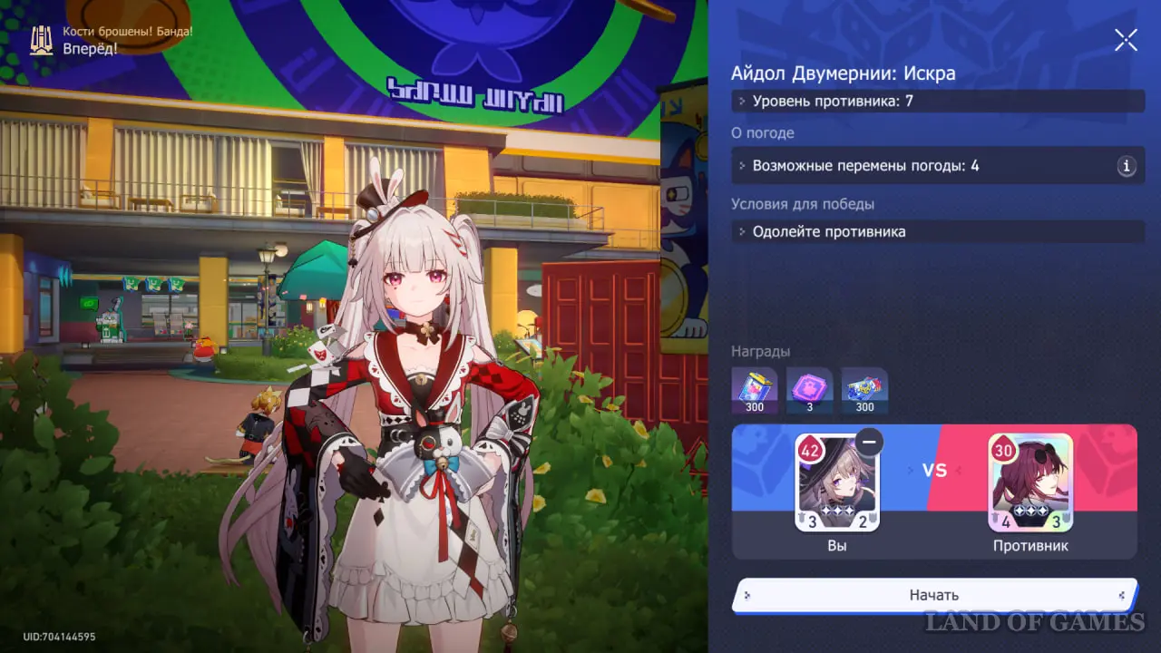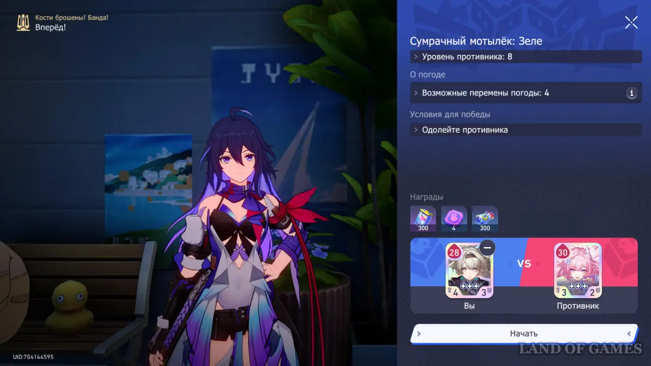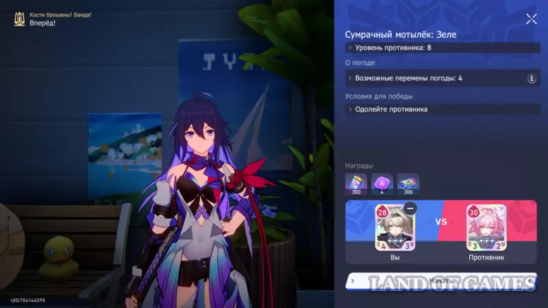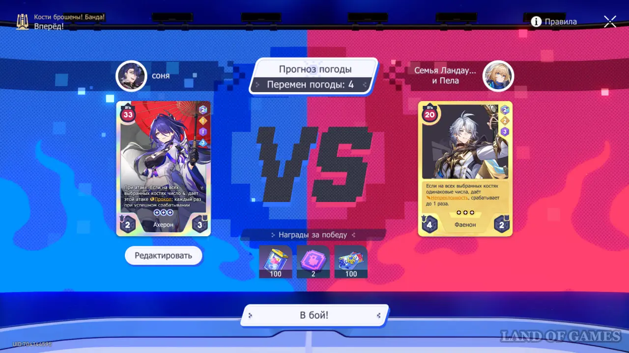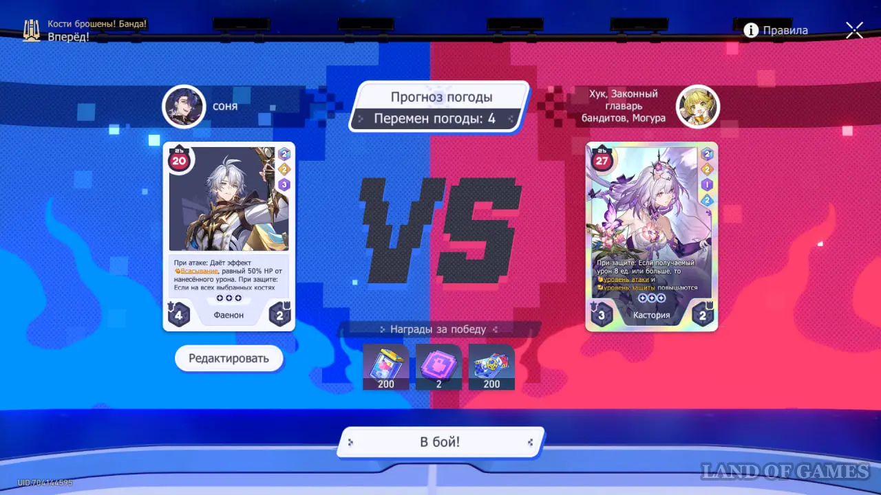 В последнем сюжетном сражении рекомендуем взять карту Светлячка и кость Чародея. Учитывая, что у нашей карты изначально меньше ХП, чем у карты Кирены, можно легко получить бонусы от погоды на 4 и 6 ходах.