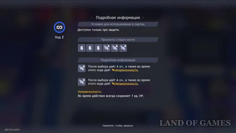 Особые кости Гиацины — Клятва. Если вам выпадет удачная сторона, вы получите 4/6 очков и Непреклонность. Кость можно использовать только при защите, а Непреклонность позволяет сохранить 1 единицу ХП даже при добивающем ударе. Также советуем сохранить эти кости ближе к концу сражения, поскольку Гиацина может лечиться самостоятельно, и эффект может понадобиться вам в экстренной ситуации.