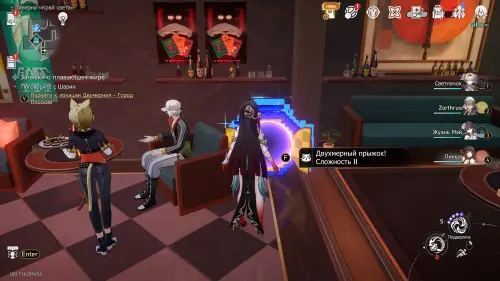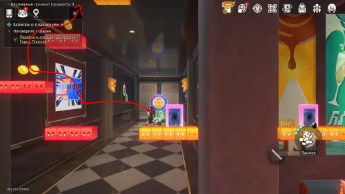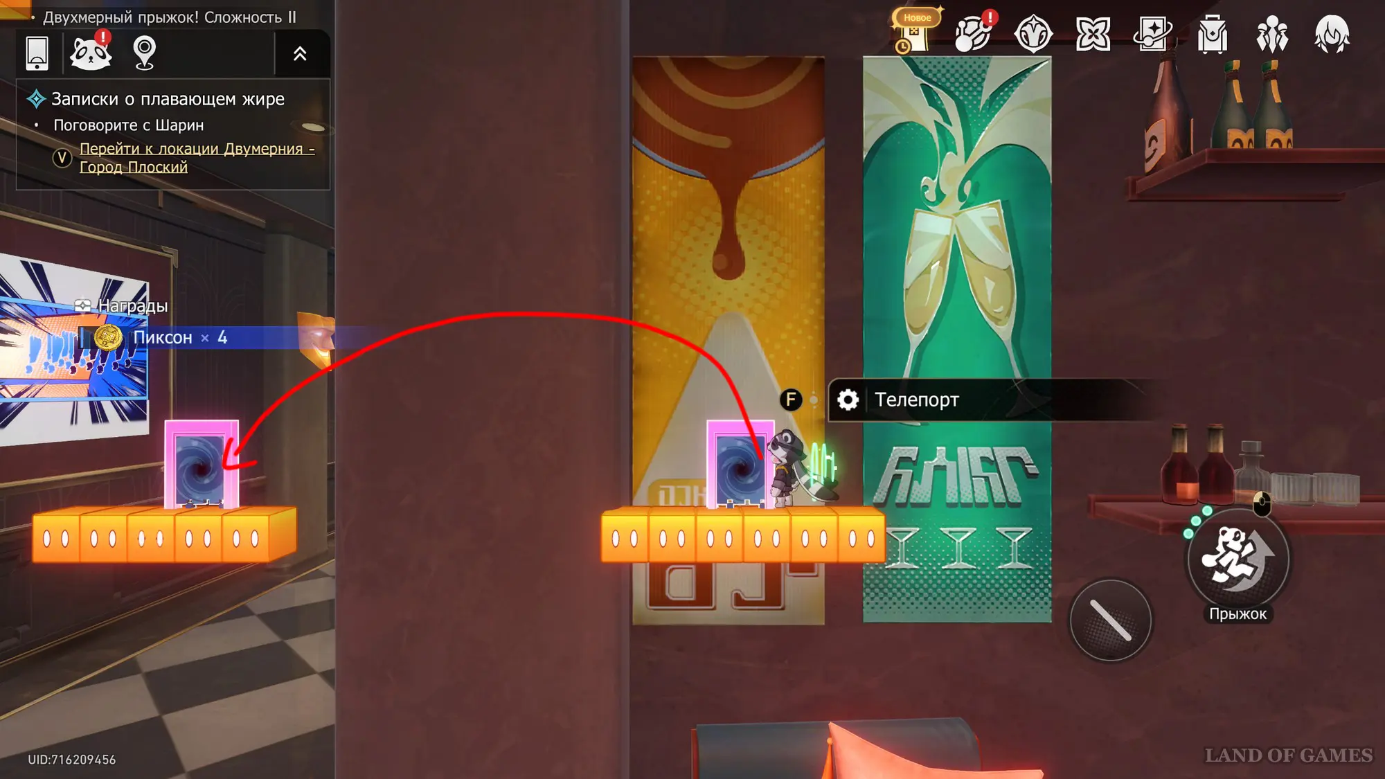 Телепортируйтесь к якорю «Лобби таверны» на 1-м этаже, а затем пройдите вперед, войдите в комнату и сразу же поверните налево, чтобы увидеть рядом со столиком трубу, которая ведет в «Двухмерный прыжок! Сложность II». Войдите в нее и начните бежать налево по площадкам, собирая монетки, и войдите в первый попавшийся вам телепорт.