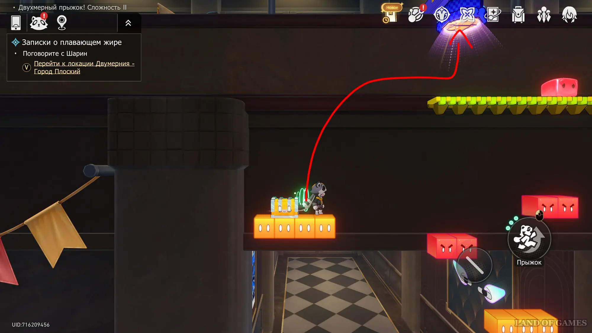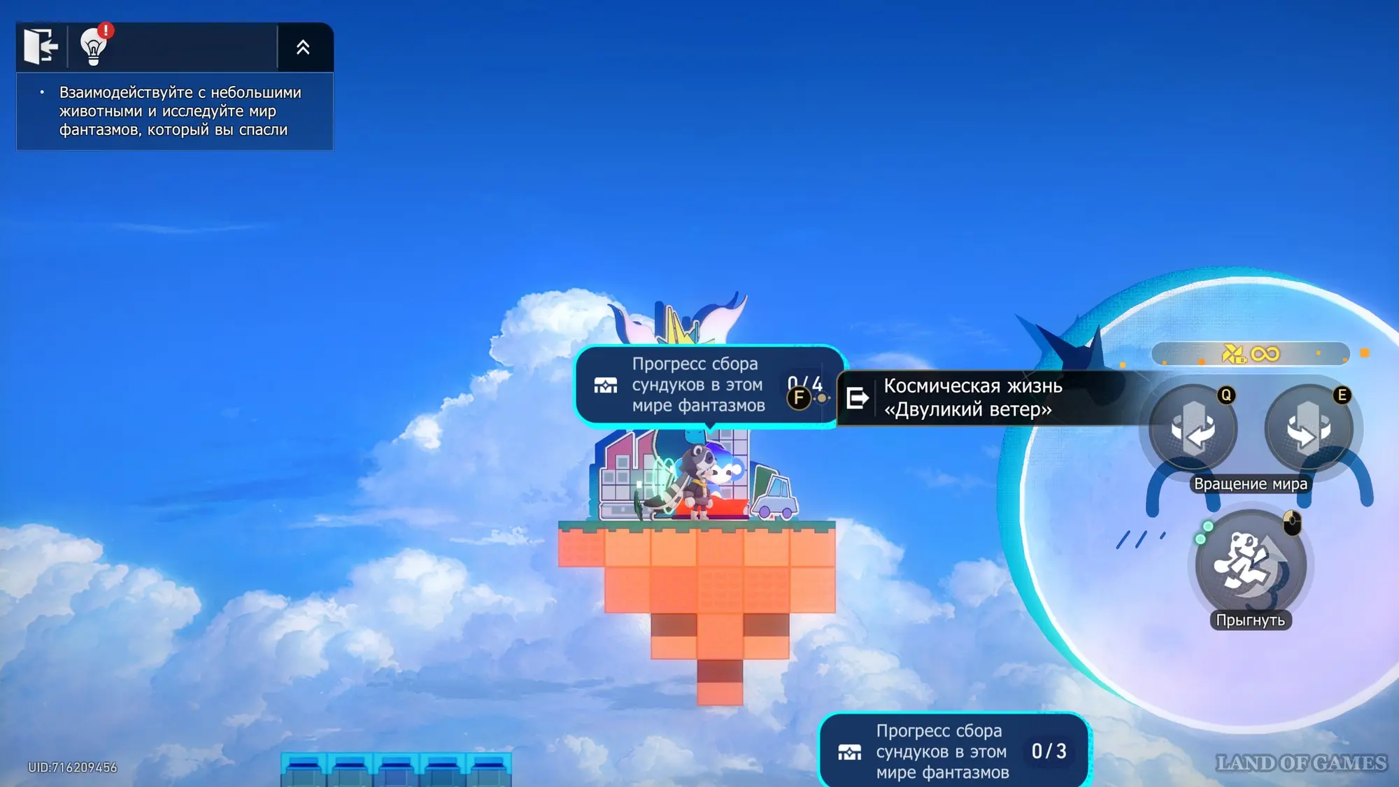 Она попросит вас освободить животных и вернуть им целостность для восстановления древних записей. На этом миссия подойдет к концу. Теперь коснитесь мира «Записки о плавающем жире», чтобы перенестись в двухмерную локацию. Запрыгните на островок наверху и справа, и коснитесь синей обезьянки для начала испытания «Космическая жизнь Двуликий ветер».