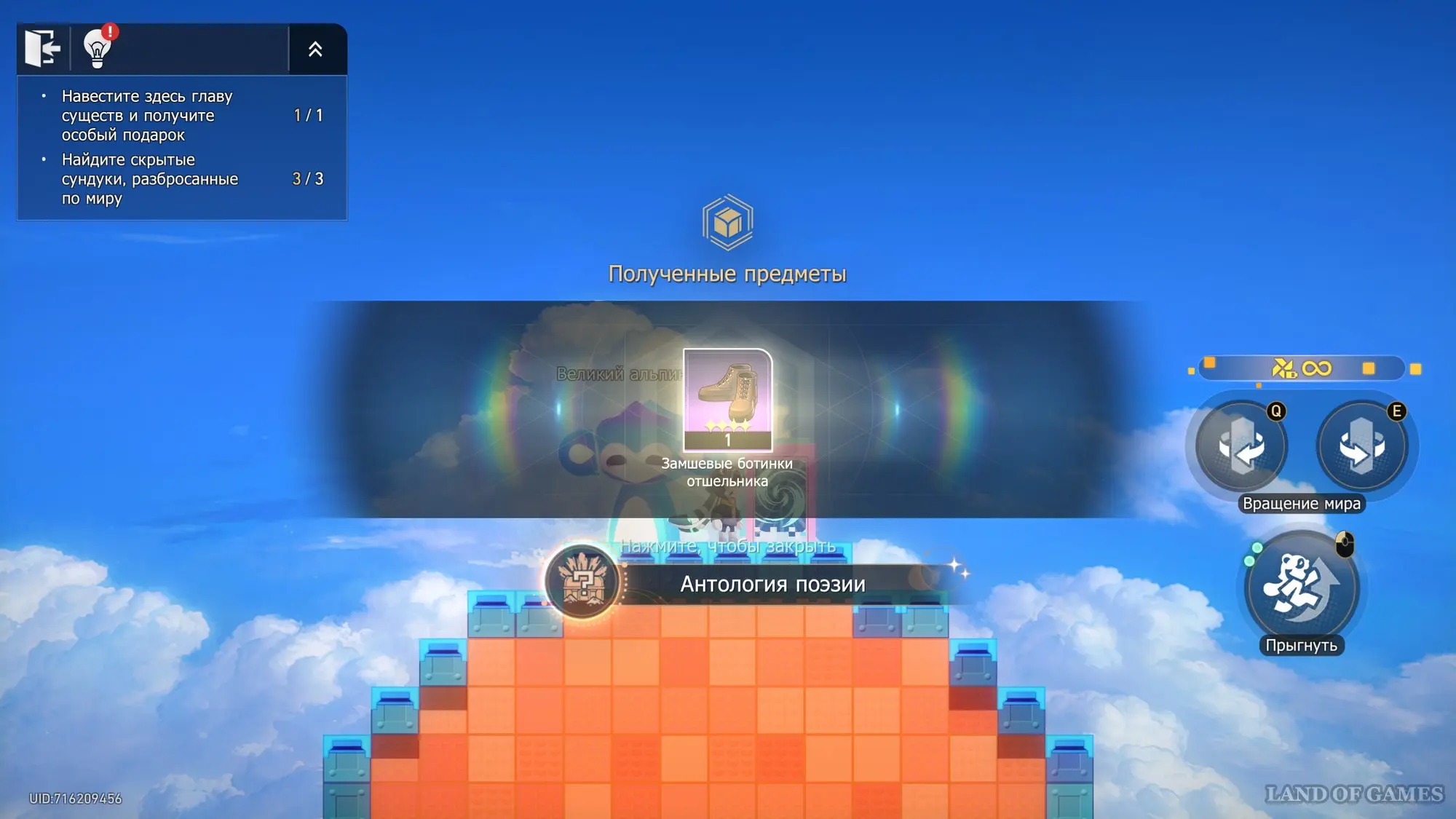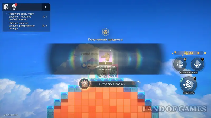 Поднимитесь на самый верх выступа и крутаните мир три раза против часовой стрелки, а затем запрыгните на последний островок и начните взбираться по нему наверх, чтобы коснуться обезьяны и получить ценный сундук. Добавим, что вы также откроете достижение «Антология поэзии».