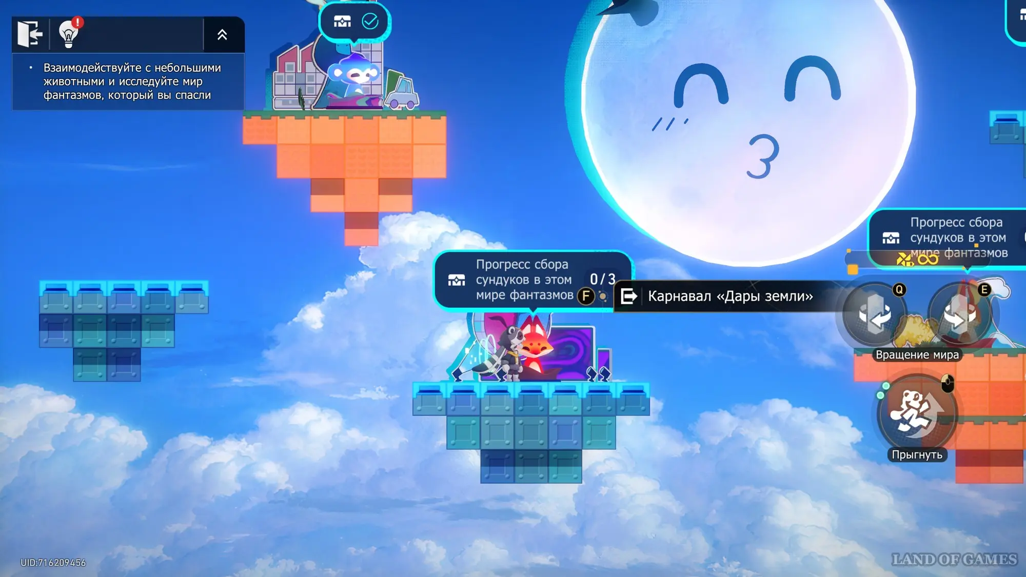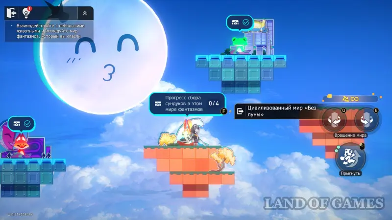 Вернувшись в мир записок, спрыгните от лягушки вниз на островок с оранжевым зайчиком и коснитесь его для начала испытания «Цивилизованный мир Без луны».