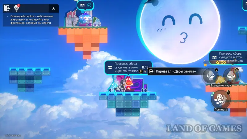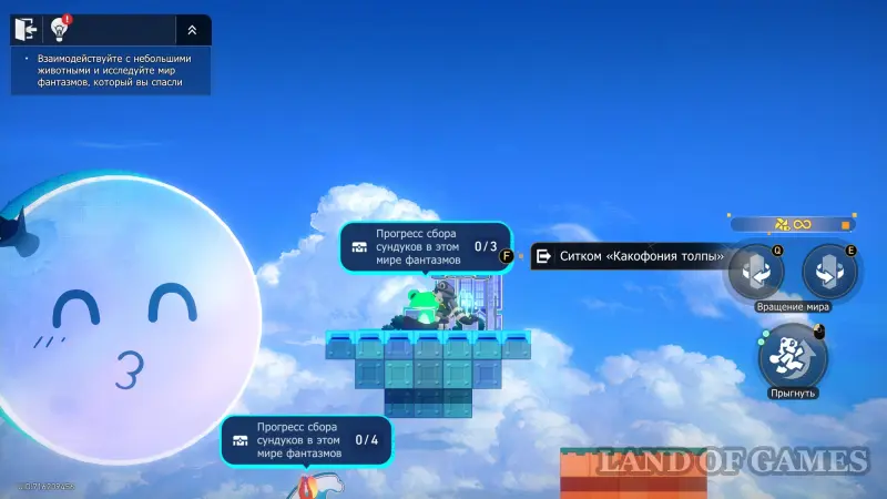 Теперь прыгните на островок справа и продолжайте карабкаться на вершину, один раз повернув мир против часовой стрелки (Е). Наверху взаимодействуйте с главной лягушкой и заберите ценный сундук.