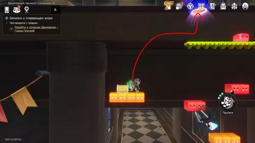 Когда уровень перестанет вращаться, и вы получите управление над персонажем, прыгните наверх, а затем поверните мир по часовой стрелке (Q). Запрыгните на основной «островок» слева и продолжайте подниматься наверх, а потом спрыгните на площадку справа и нажмите на кнопку «Восстановить краски».
