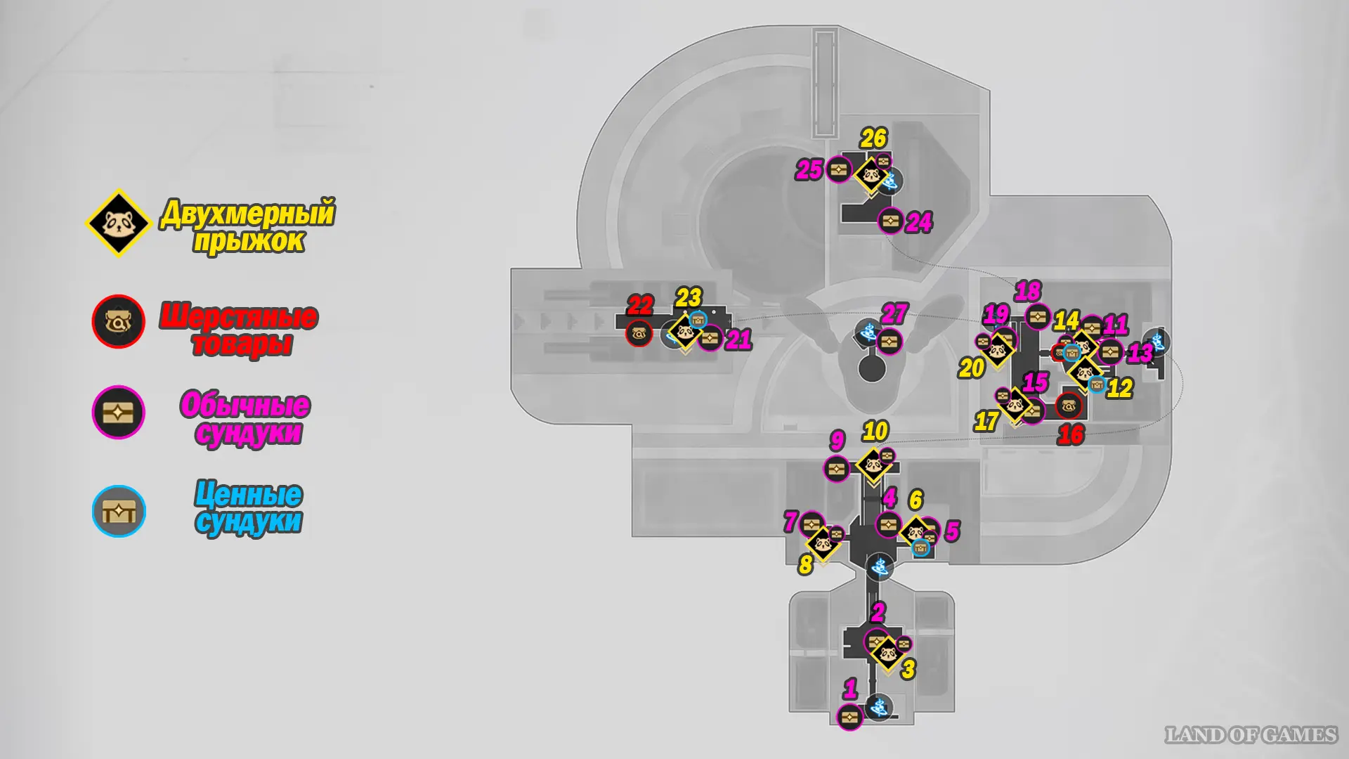 Здание академии состоит из 3-х этажей, в которых можно отыскать 32 точки сбора местных сокровищ (так как в Двухмерных прыжках может быть несколько сундучков, мы обозначили местонахождение входных труб, а уже внутри пункта показали все трофеи). На картах ниже можно посмотреть их примерное расположение. Подробную информацию по поиску ларцов с сокровищами можно найти в нашем отдельном руководстве.