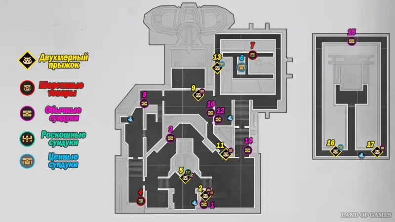 На территории данной локации можно отыскать 29 сундуков, причем сделать это вам удастся только после начала выполнения сюжетного задания под названием «Добро пожаловать в утопию!». При этом часть Двухмерных прыжков содержит сразу несколько наград – мы отметили входные трубы и подробно показали все доступные трофеи в каждой локации. На карте ниже можно посмотреть их примерное расположение. Подробную информацию по поиску ларцов с сокровищами можно найти в нашем отдельном руководстве.