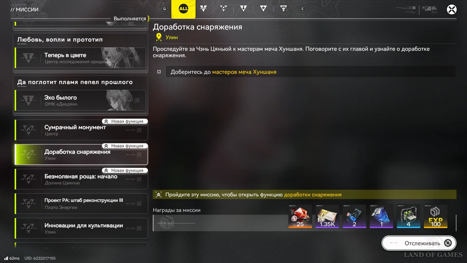 Квест «Доработка снаряжения» с пометкой новой функции появится на карте главного города Улина в одноименном регионе. Переместитесь к точке ТП перед Кабинетом в основном столбе (запад локации), а оттуда бегите в сторону Бюро мастеров мечей на север и поговорите с Лянь Сяоу, главой Хуншаня. Мастер расскажет о доработке снаряжения, а после вы пройдете интерактивную обучалку, знакомящую с процессом улучшения характеристик снаряжения.