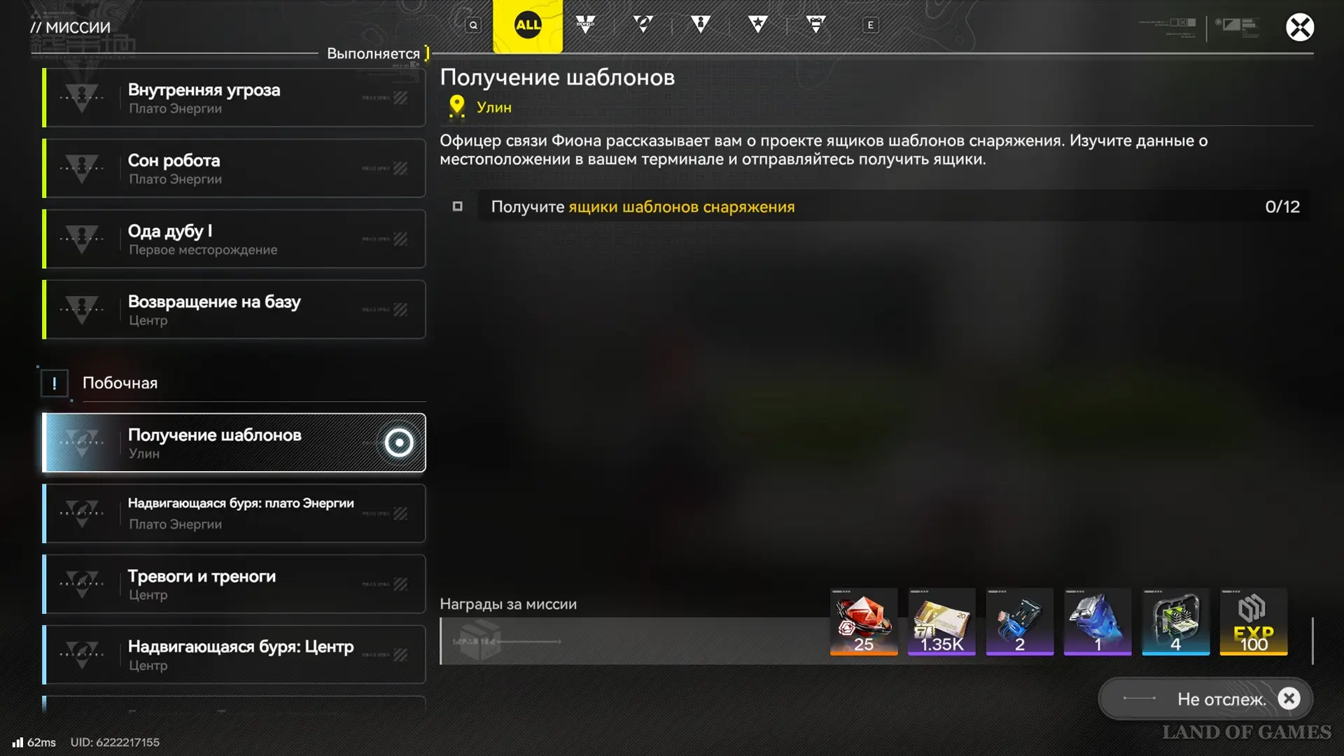 Квест «Получение шаблонов» появляется в списке миссий сразу после разговора с Лянь Сяоу: Эндмину поступит сообщение от Фионы, которая отчитается о готовности партии ящиков и предложит отправиться к отмеченным на терминале местам. В условиях миссии будет отображаться прогресс сбора 12-ти ящиков шаблонов снаряжения – местонахождение каждого из них мы разберем ниже.