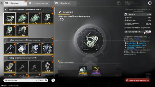 | Эффект набора (3 шт.): сила искусств +30. Наложив электризацию, владелец получает +50% к электрическому урону на 10 сек.; наложив застывание — +50% к криоурону на 10 сек. Бонусы не складываются. |