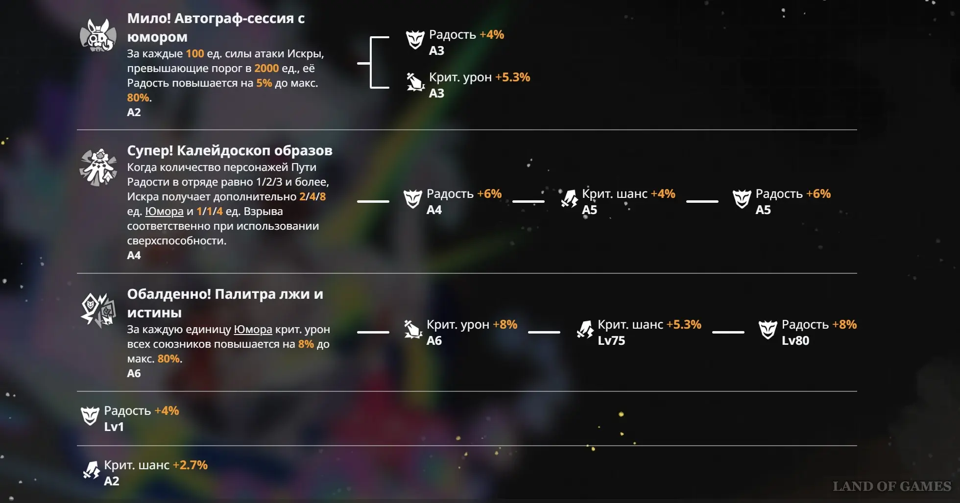 Если вы хотите узнать, как вообще функционирует Путь Радости, и что именно он привносит в бой, то рекомендуем вам прочитать наш гайд на Яо Гуан, где мы подробно рассказываем об этом в разделе про ее геймплей. Данная информация поможет вам лучше понять принцип игры за Искру, ведь ее механики тоже завязаны на навыке Радости и статусе Настоящий хит.