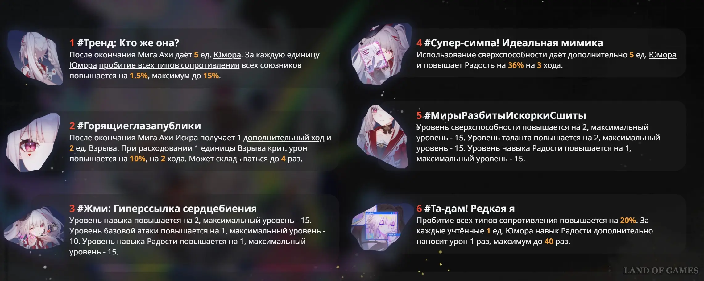 | МирыРазбитыИскоркиСшиты | Уровень ульты и таланта возрастает на два, а навыка Радости – на один. Максимальный левел у всех троих увеличивается до 15-го. | Дает среднюю пользу. |