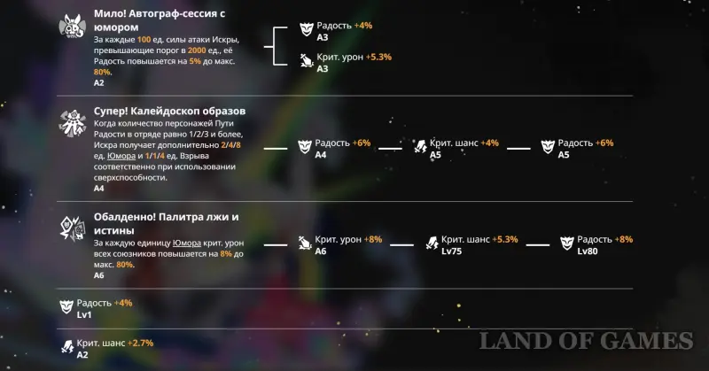 - Ее можно считать своеобразным саппортом под команды Радости, так как своим навыком она может генерировать единицы Юмора (если вам сильно повезет, то до 20 зарядов за ход) для всего отряда, что может существенно повысить общий DPS. Плюс, Искра дает очень полезный бафф к критическому урону, который тоже зависит от стаков Юмора.