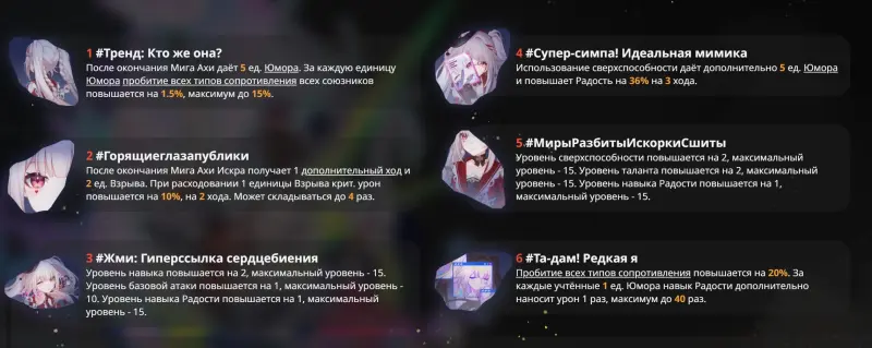 | Тренд: Кто же она? | После завершения Мига Ахи дает 5 единиц Юмора. За каждую единицу Юмора пробитие всех типов сопротивления всех союзников возрастает на 1,5% (максимум до 15%). | Неплохой саппортский эйдолон, который упрощает набор зарядов Юмора команде и дает неплохой бафф. Чем больше персонажей Радости будет в команде, тем полезнее окажется Е1. |
