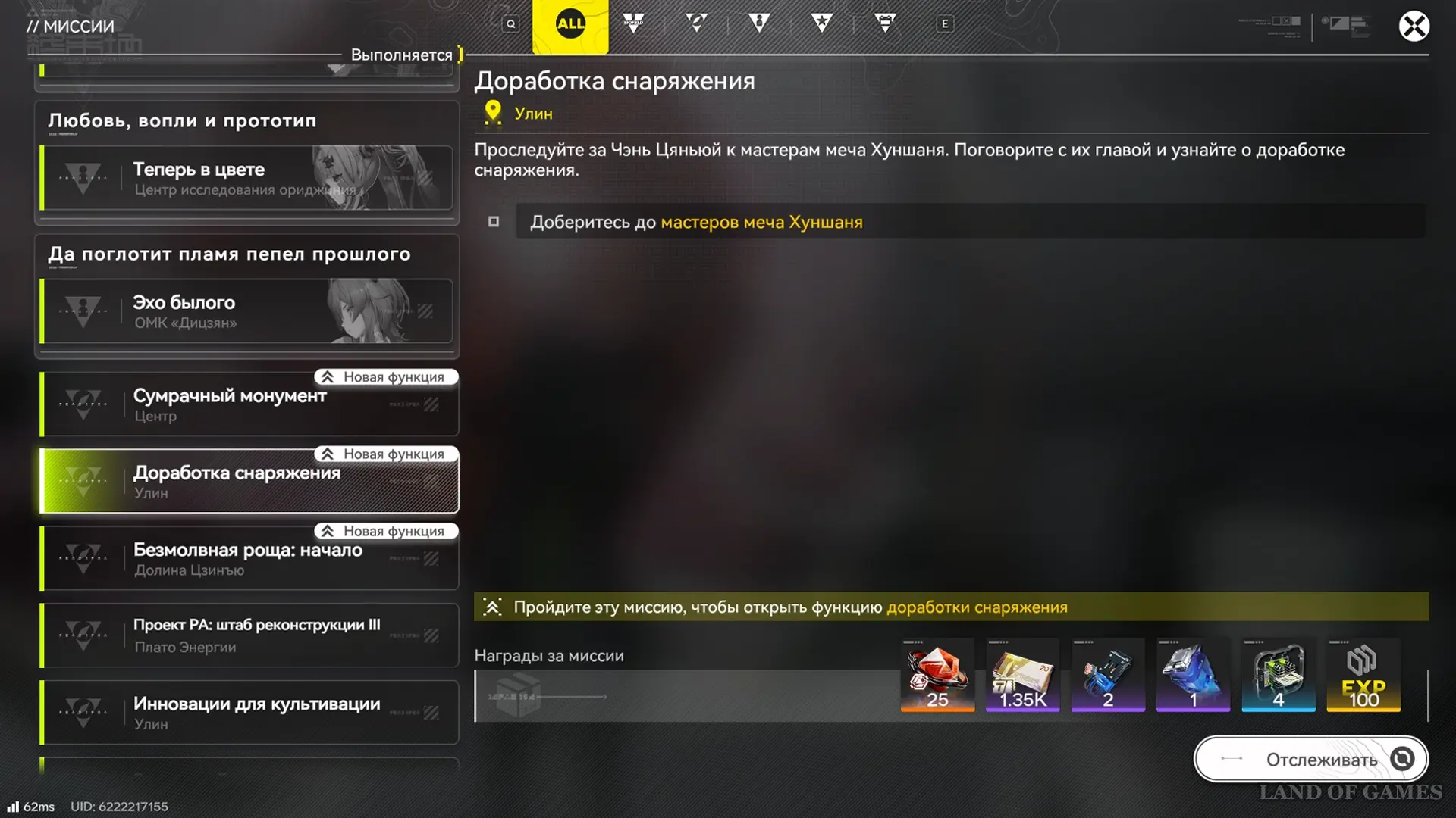 Способность прокачивать характеристики артефактов оперативников, как и шаблоны золотого снаряжения, открываются в Улине: квест «Доработка снаряжения» с пометкой новой функции отобразится на карте главного города региона.
