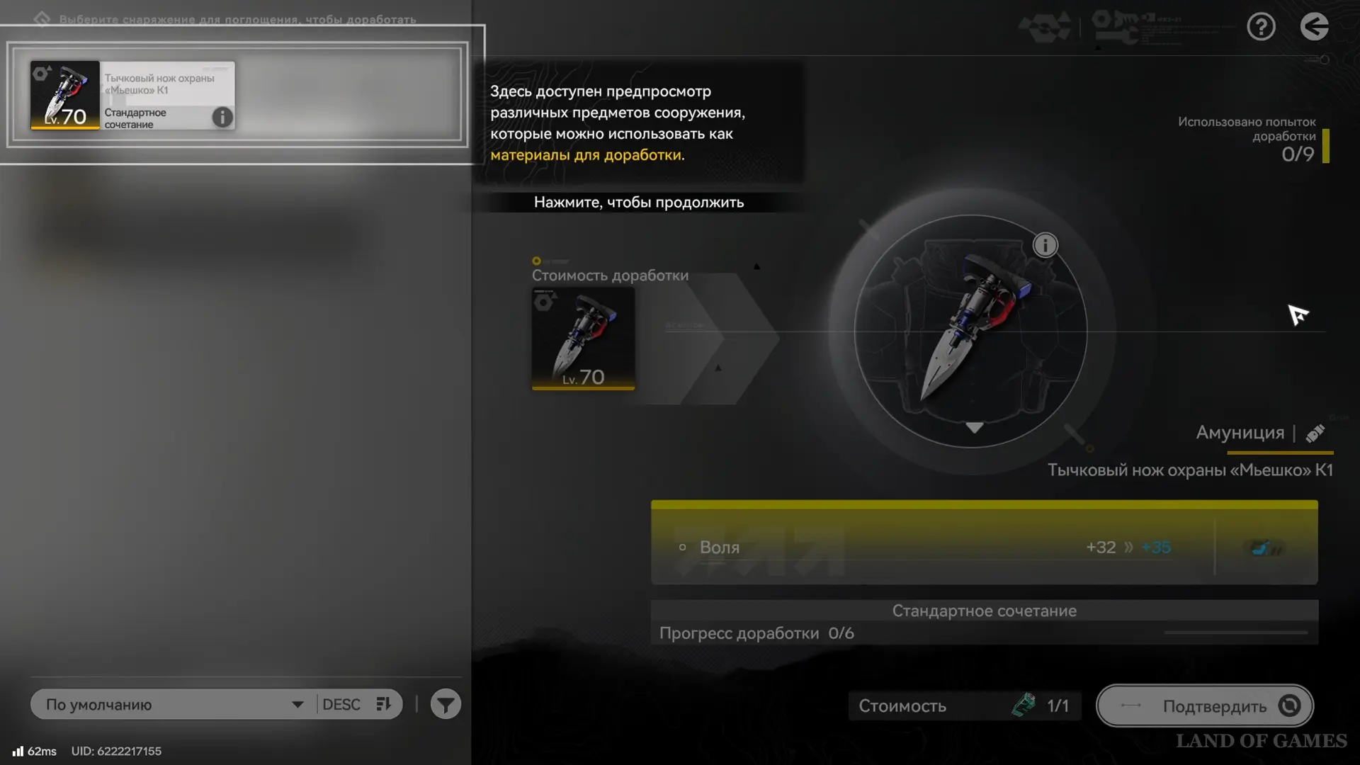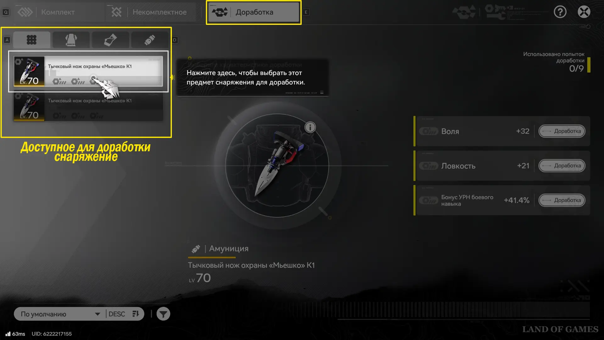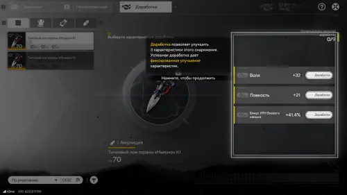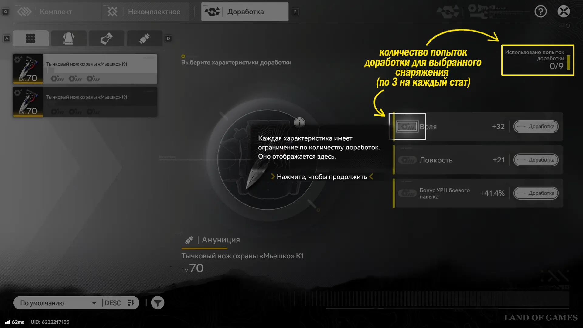 После выбора предмета справа появится список из трех характеристик, каждая из которых улучшается отдельно. Всего доступно 9 попыток прокачки — по 3 на каждый параметр. После их использования предмет больше нельзя доработать.
