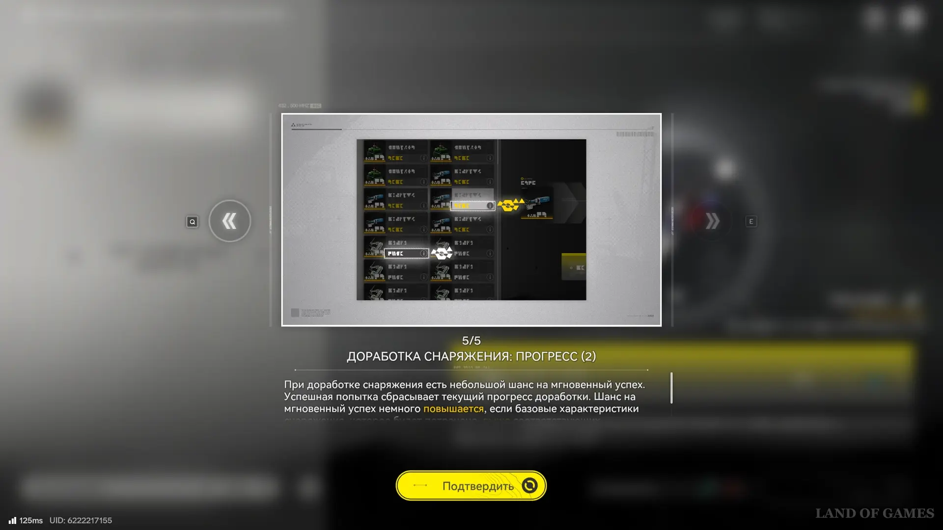 Шкала прогресса отображает то, сколько осталось до завершения текущей попытки. Когда она заполняется, начинается следующая попытка. Если во время заполнения выпадает мгновенный успех, шкала сбрасывается к нулю, и доработка продолжается в рамках той же попытки. Если с улучшением не повезло и шкала заполнена до предела, то на второй попытке успех будет гарантирован.