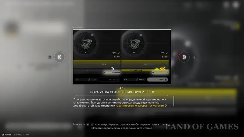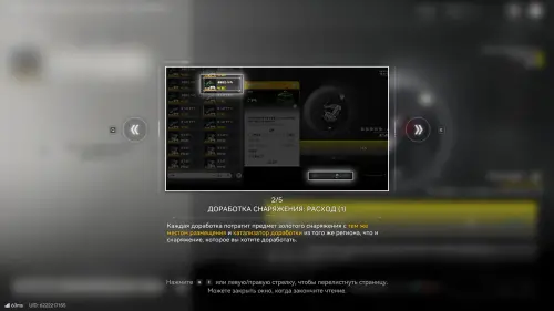 После выполнения квеста перейдите в «Сборку снаряжения» (на правой панели в главном меню) и выберите сверху вкладку «Доработка». На панели слева будут части снаряжения, которые вы можете улучшить.