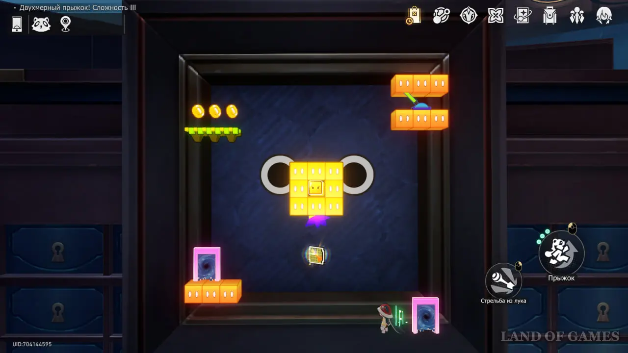 Войдите в Двухмерный прыжок в Великом тайнике и дойдите до экрана с эфемером. Чтобы убрать клетки вокруг, запрыгните на платформу и выстрелите из лука, чтобы сдвинуть переключатель.
