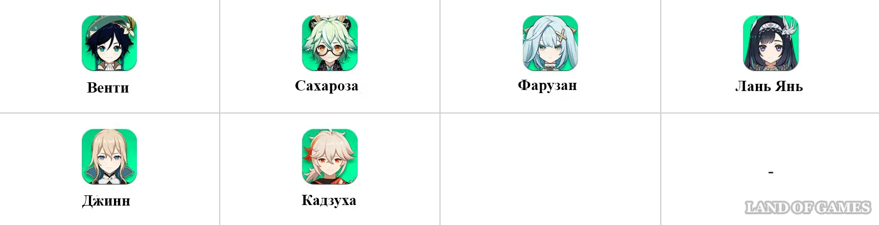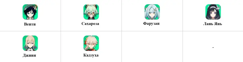 Начнем с Анемо персонажей – на картинке выше мы показали все оптимальные варианты. Лучшим из них, конечно же, будет Венти, который не только позволит активировать ведьмовской бафф, но также снабдит Варку баффом урона и стяжкой. Остальные будут плюс-минус одинаково полезными, так как каждый из них может предоставить Варке какой-нибудь бонус, например, Фарузан повысит Анемо урон, а Лань Янь даст щит.