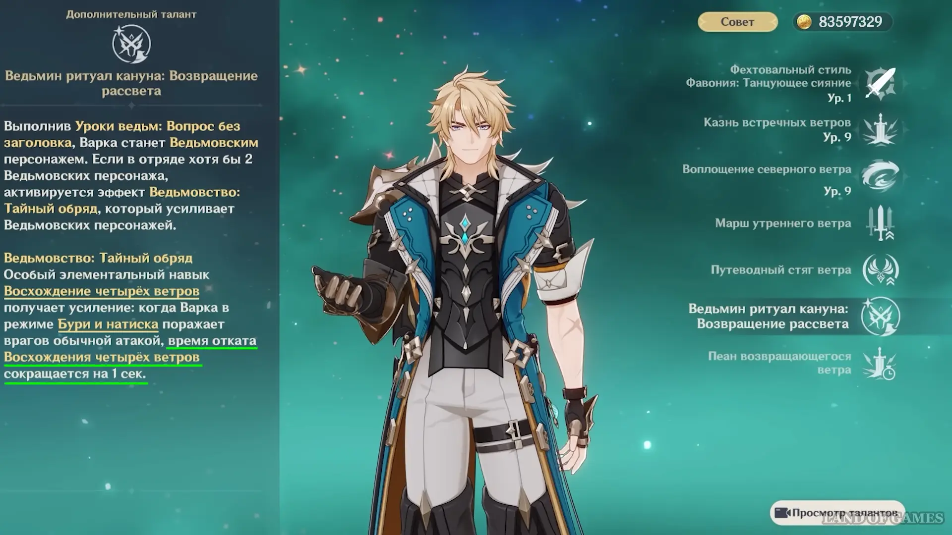 Варка обладает уникальной пассивкой «Ведьмин ритуал кануна: Возвращение рассвета», которая активируется после выполнения «Уроков ведьмы: Вопрос без заголовка» и при наличии в команде хотя бы двух ведьмовских персонажей. Она приводит к срабатыванию эффекта «Ведьмовство: Тайный обряд», который усиливает специальный элементальный навык «Восхождение четырех ветров», сокращая его время отката на 1 секунду, когда герой поражает врага обычными атаками в режиме «Буря и натиск».