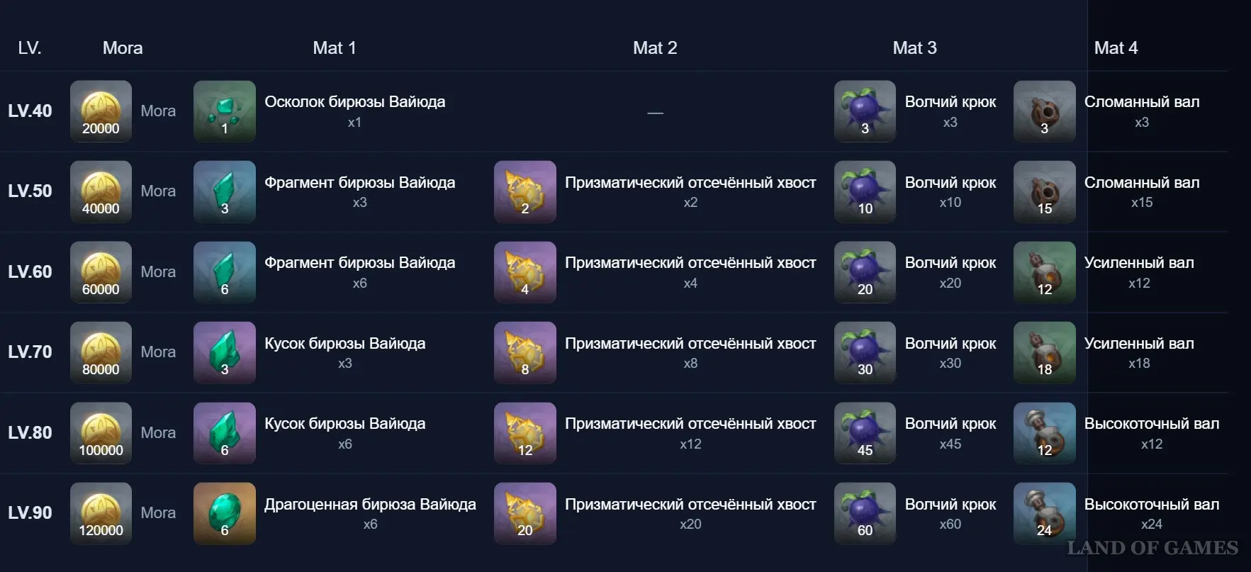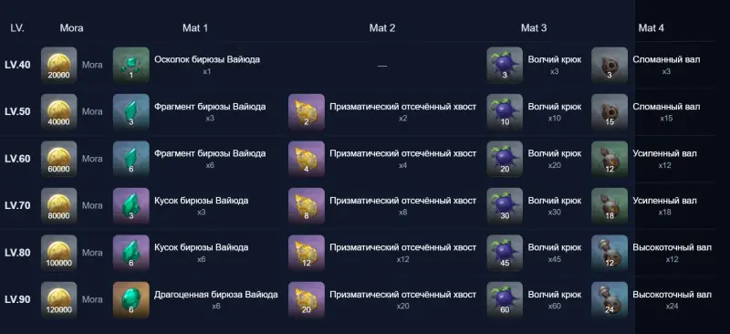 Добыть бирюзу Вайюда можно с Анемо гипостазиса, Двалина Ужаса Бури, Секи но Ками, Алгоритма полуизвечной матрицы оператора наблюдения и Магу Кэнки. Они также продаются в сувенирной лавке. Призматический отсечённый хвост добывается с Лучезарного лунного геккона. Волчий крюк является местной диковинкой Мондштадта. В отдельном гайде мы указали его расположение.