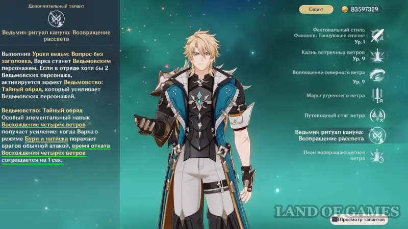 Второй – Марш утреннего ветра – дает следующий бонус: когда в команде есть Пиро, Гидро, Электро или Крио персонажи, каждые 1000 очков силы атаки Варки дают ему 10% бонус к Анемо урону и дамагу от соответствующей стихии (среди вышеупомянутых типов элементов бафф получает только один). Максимальный размер бонуса равен 25%.