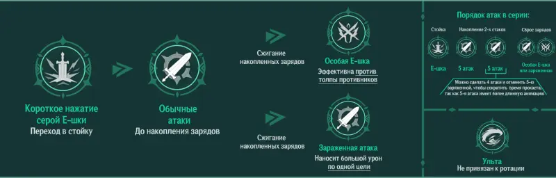 - Е-шка и переход в стойку → 5 обычных атак до накопления 1-го стака → еще 5 обычных атак до накопления 2-го стака → сброс стаков либо нажатием особой Е-шки, эффективной по группе врагов, либо заряженной таргет-атакой, которая бьет преимущественно по одной цели.