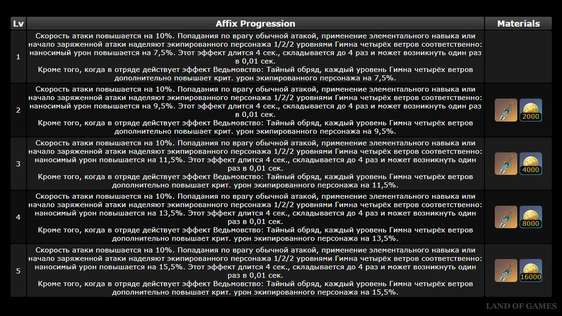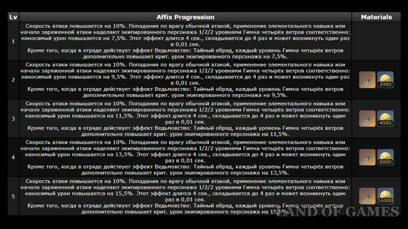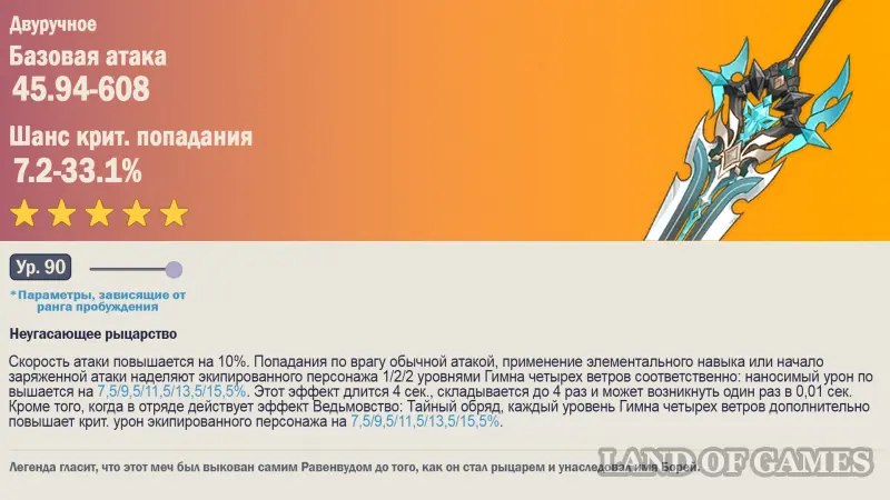 Описание пассивки «Неугасающее рыцарство»: на 10% увеличивает скорость ударов. Попадание обычной атакой, активация элементального навыка и инициация заряженной атаки наделяют носителя 1/2/2 стаками «Гимна четырех ветров», каждый из которых повышает исходящий урон на 7,5% – 15,5%*. Эффект длится 4 сек., суммируется до 4 раз и триггерится с интервалом 0,01 сек.